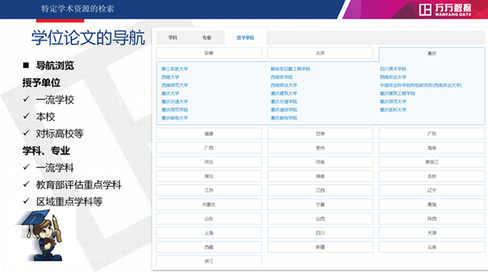 学位论文检索可以从学科专业和授予单位三个维度来进行导航浏览。