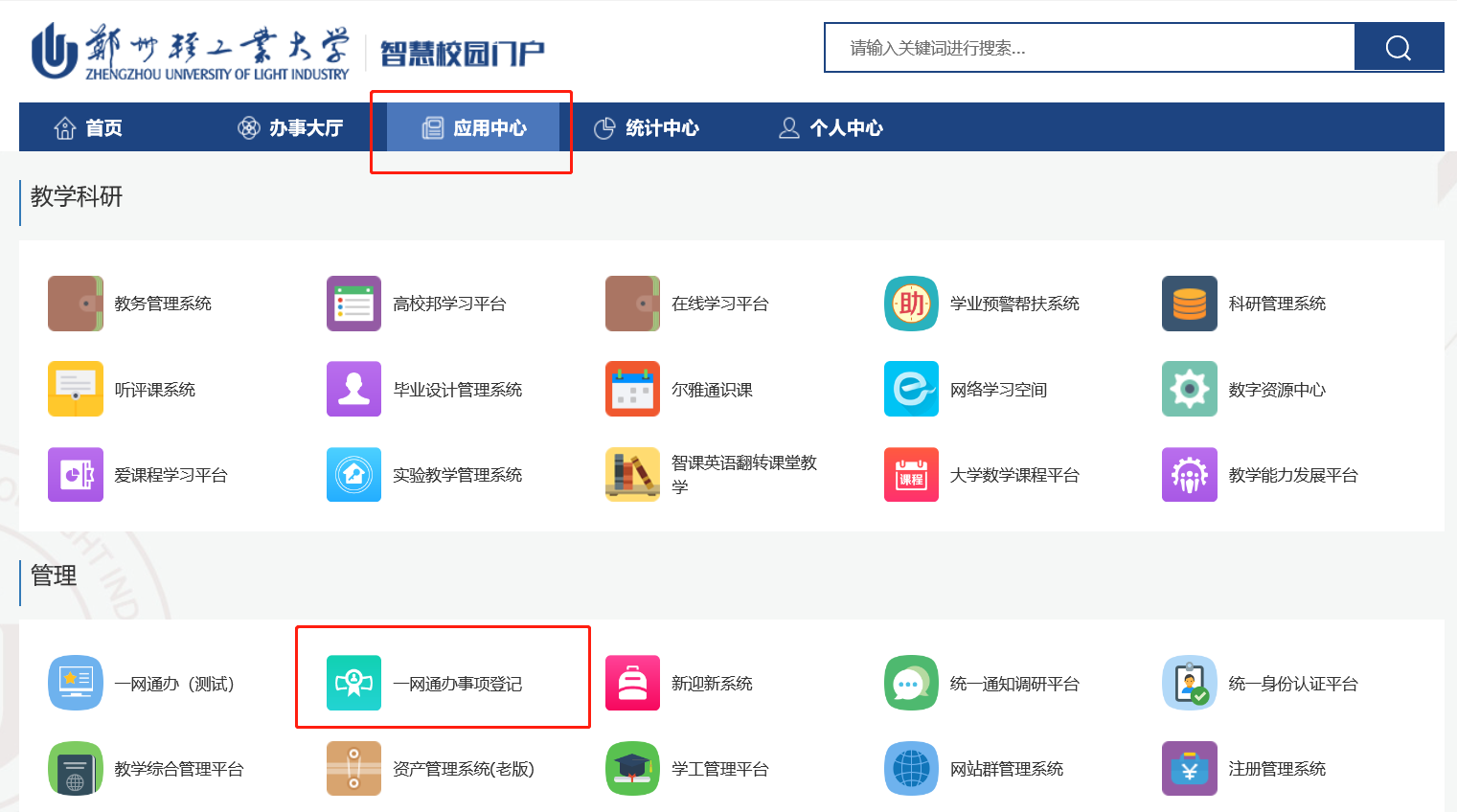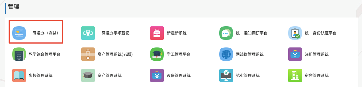 1、进入智慧校园服务门户,点击导航栏“应用中心”,在“管理类”中,点击“一网通办事项登记”;