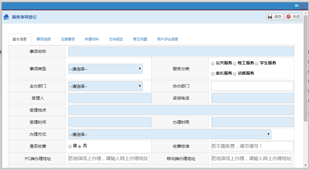 注:由于系统还在测试状态,本次补录除“新建”、“修改”、“预览”之外的按钮和功能模块(“申请上线”、“事项审核”等)暂不用操作。