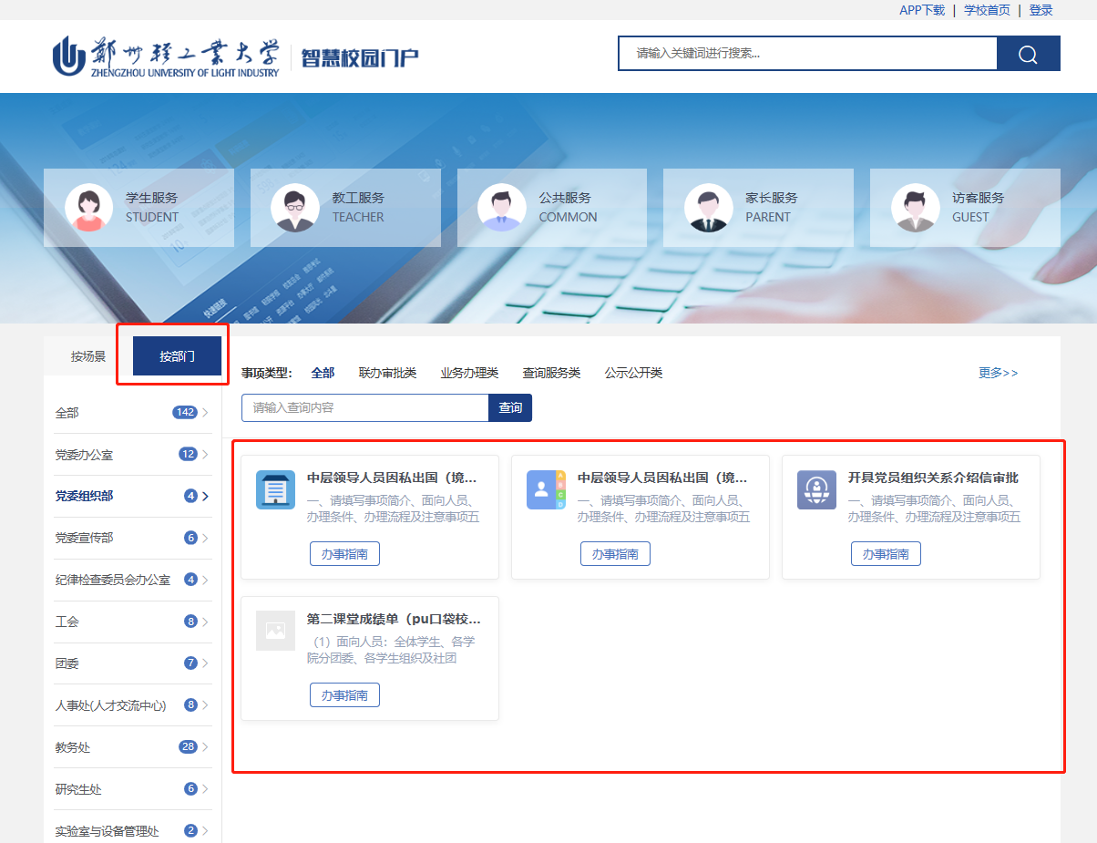 3、进入智慧校园服务门户“应用中心”中的“一网通办(测试)”,在页面左侧点击“按部门”分类,点击您所在的二级单位,可预览您填写的事项在全校师生使用的“一网通办”大厅中的实际展示效果。