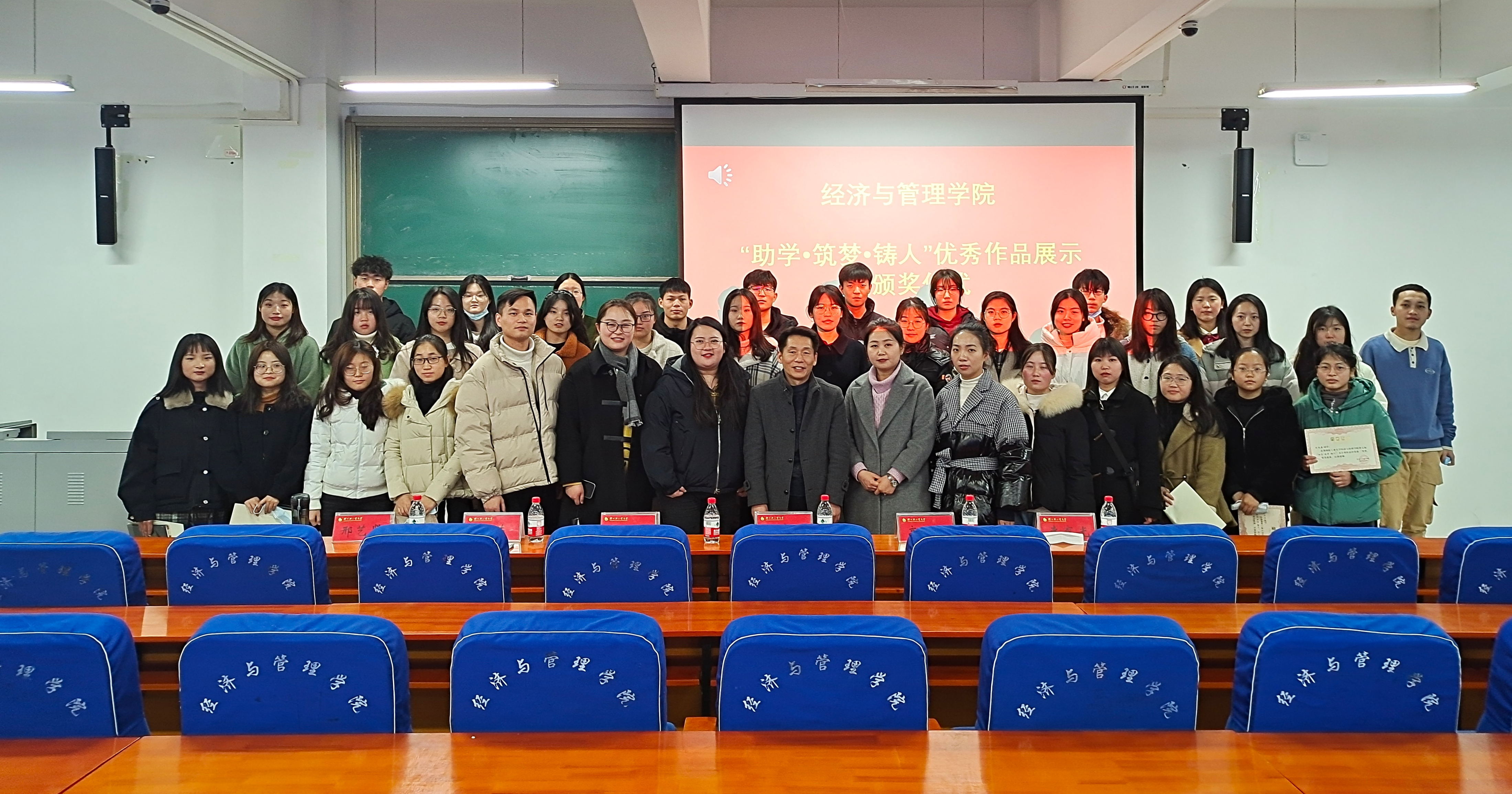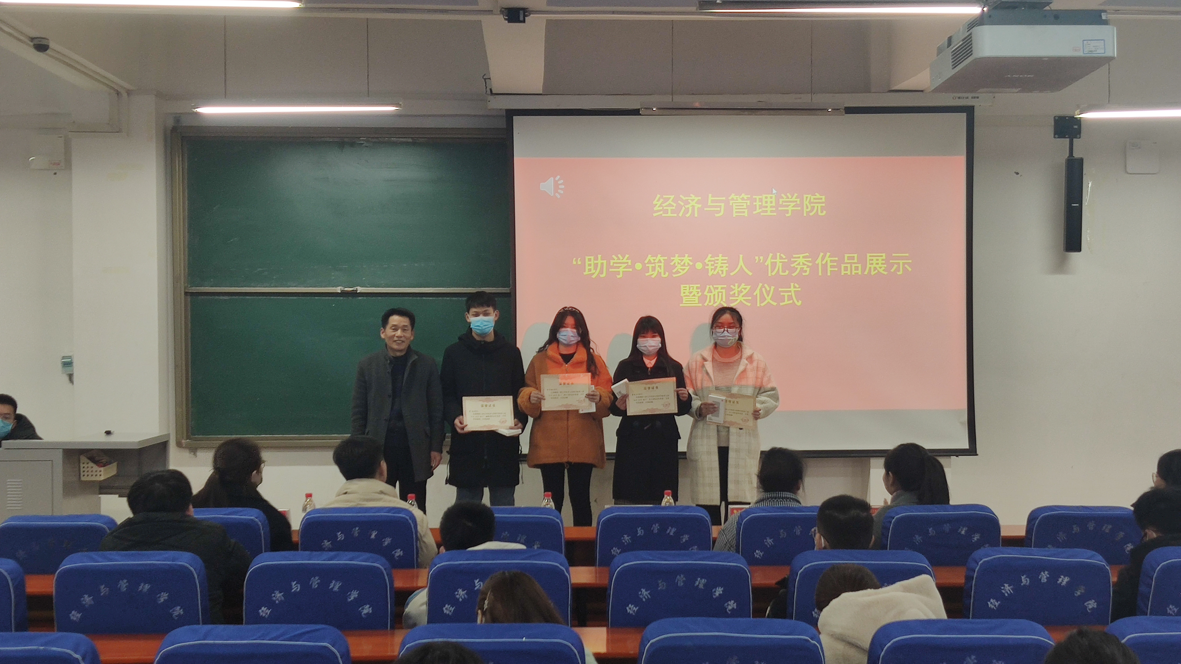 为进一步宣传国家的资助政策,激励广大受助学生奋发自强、诚实守信、感恩奉献,经济与管理学院于12月17日举办“助学•筑梦•铸人”优秀作品展示暨颁奖仪式。经济与管理学院党委副书记陈章美老师、各年级专职辅导员老师以及学生代表参加此次活动。
