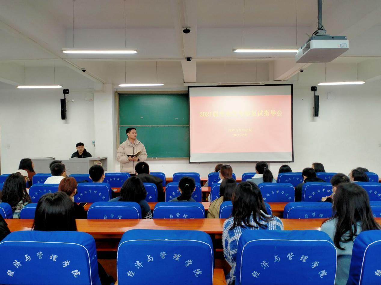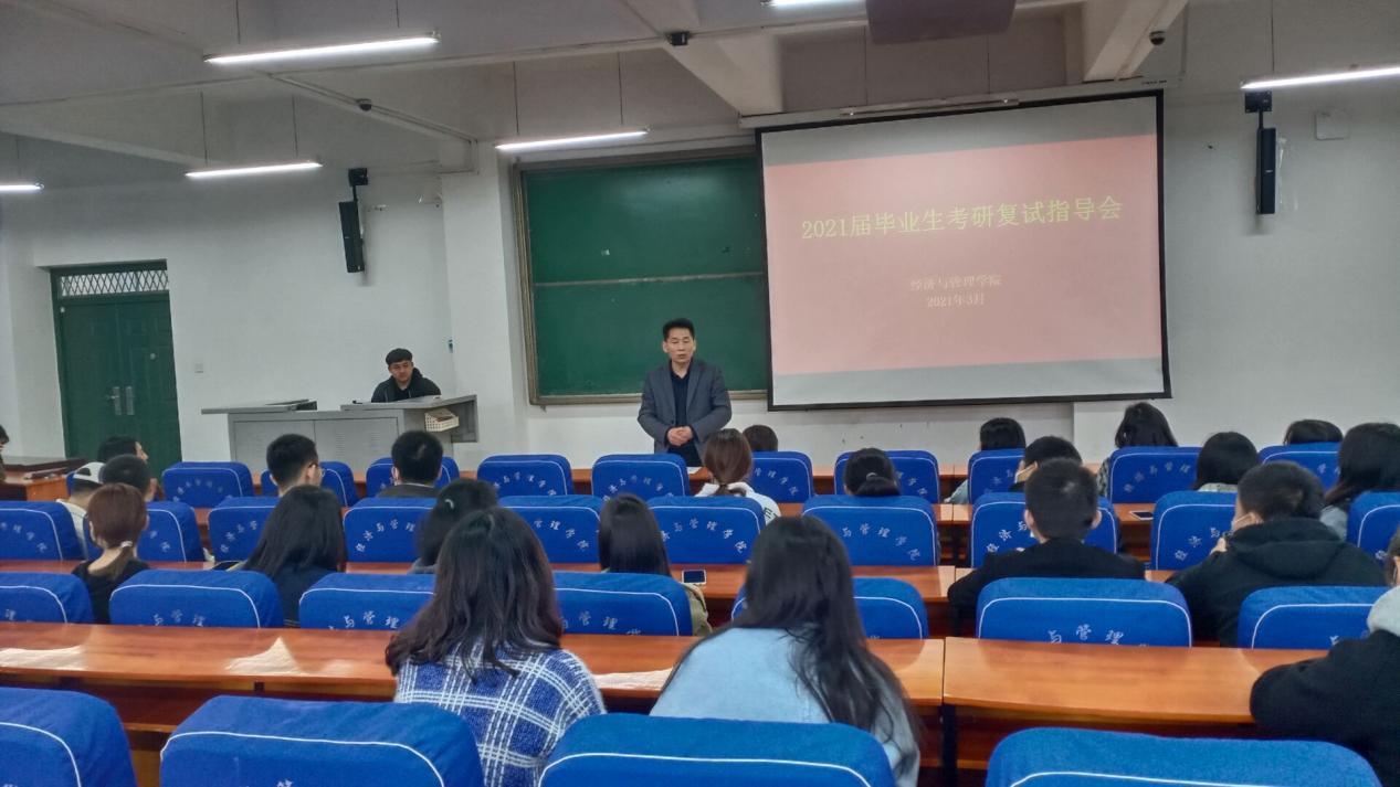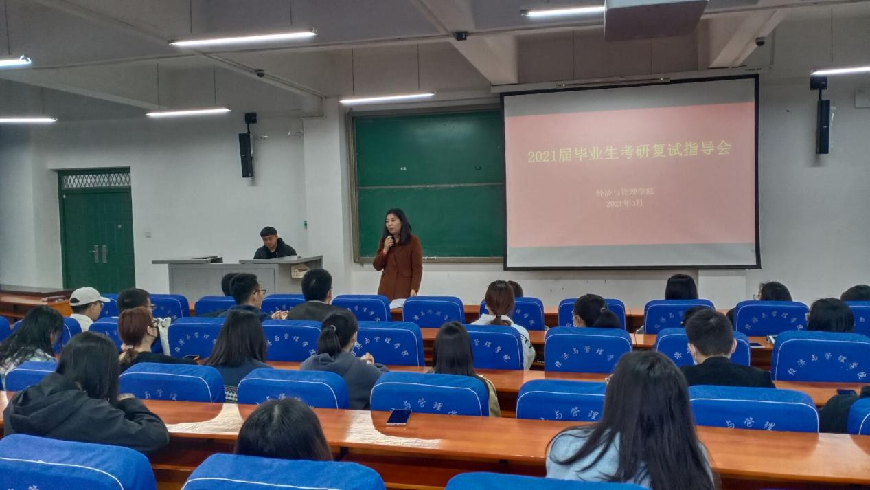 3月12日上午,经济与管理学院在经管楼211召开2021届毕业生考研复试指导会。学院党委副书记陈章美,Mpacc教育中心、MBA教育中心教学管理部主任彭青秀,2020级研究生代表张佳讯以及2021届考研学生参加本次指导会。会议由就业专职辅导员熊苗主持。