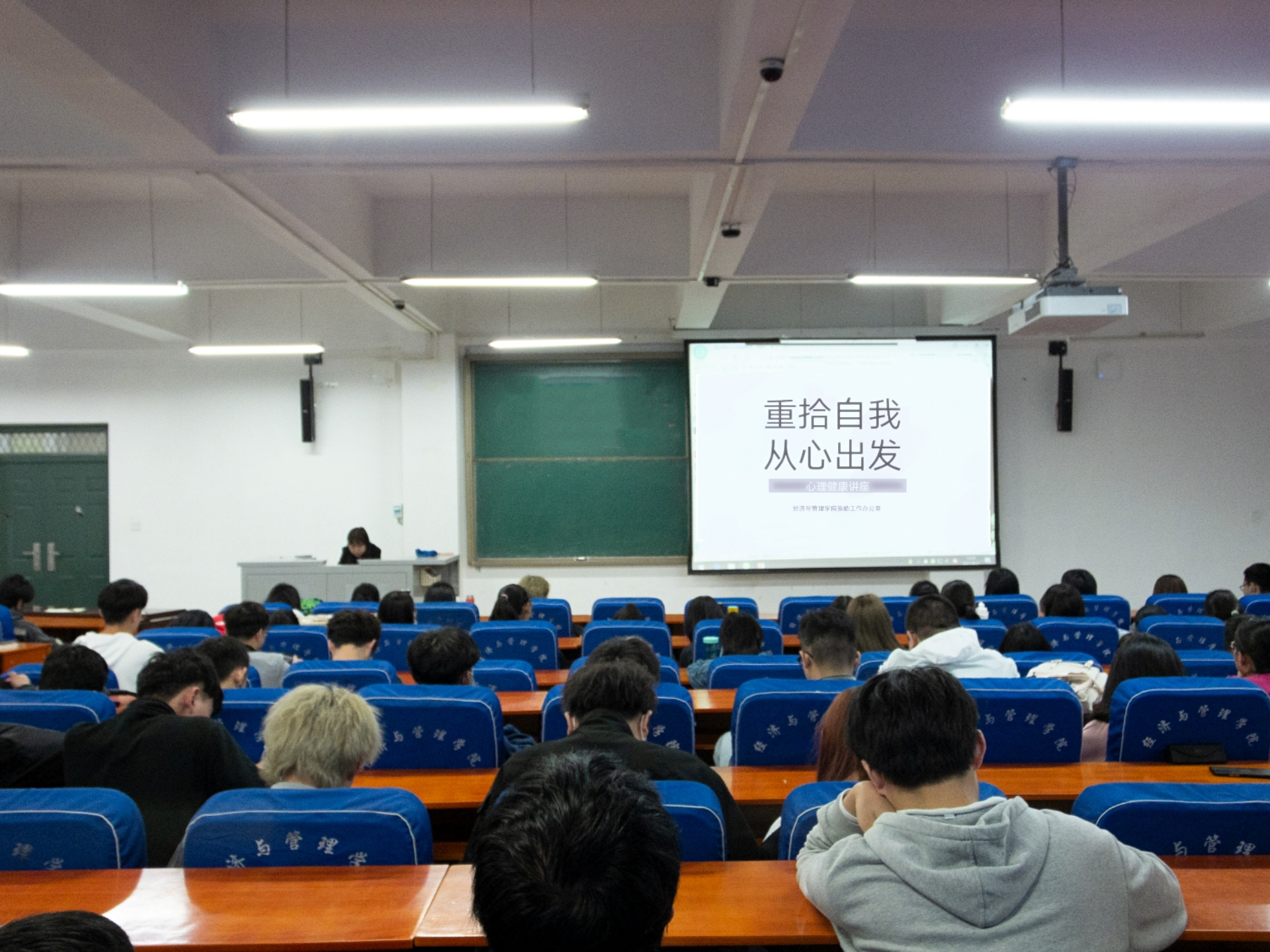 为进一步了解当代大学生常见心理问题,关注经济困难大学生心理健康状态,提高我校大学生对心理健康问题的重视,将心理健康常识普及到每一位同学心中,经济与管理学院于2021年4月28日中午12:20在经管楼211举办“立德 励志 励行”发展性资助成长计划之“重拾自我,从心出发”主题心理讲座。