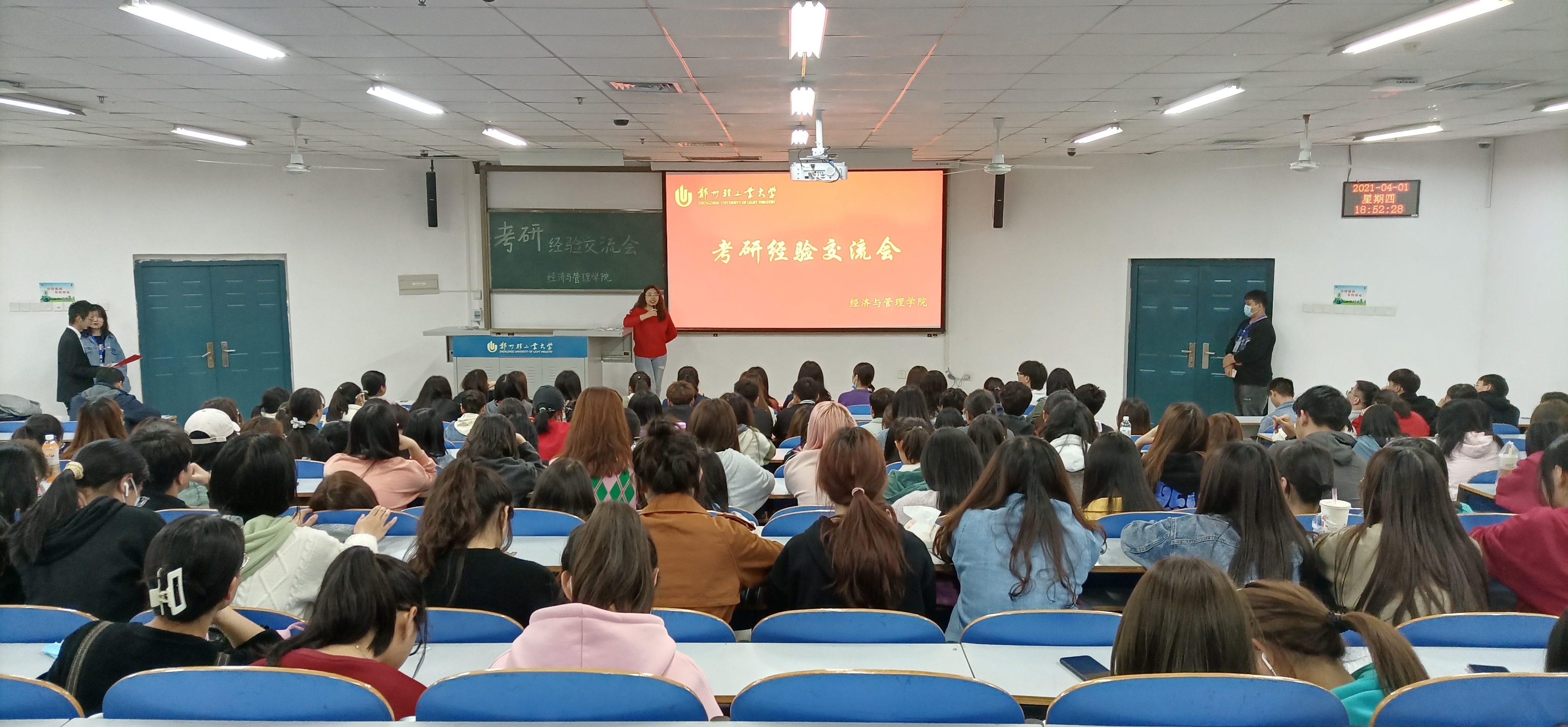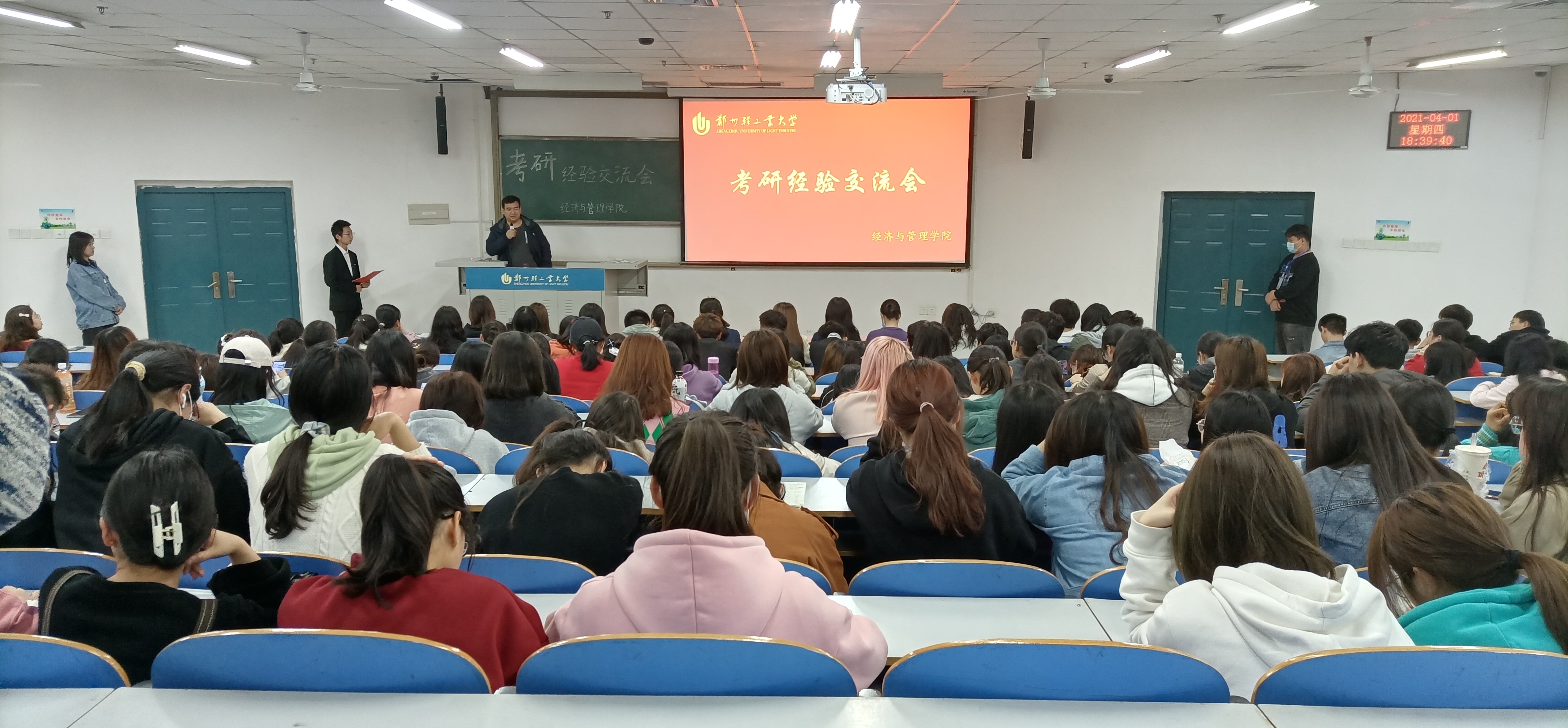 为进一步提高广大学子的考研热情,增强学生考研信心,明确考研目标,掌握相关考研技巧,经济与管理学院于4118:30在三教楼108教室举办2021年度考研经验交流会。经济与管理学院会计系主任薛龙老师国际经济与贸易系主任田珍老师以及在2020年考研中取得优异成绩的17级同学参加了本次活动,为同学们答疑解惑,提供宝贵经验。