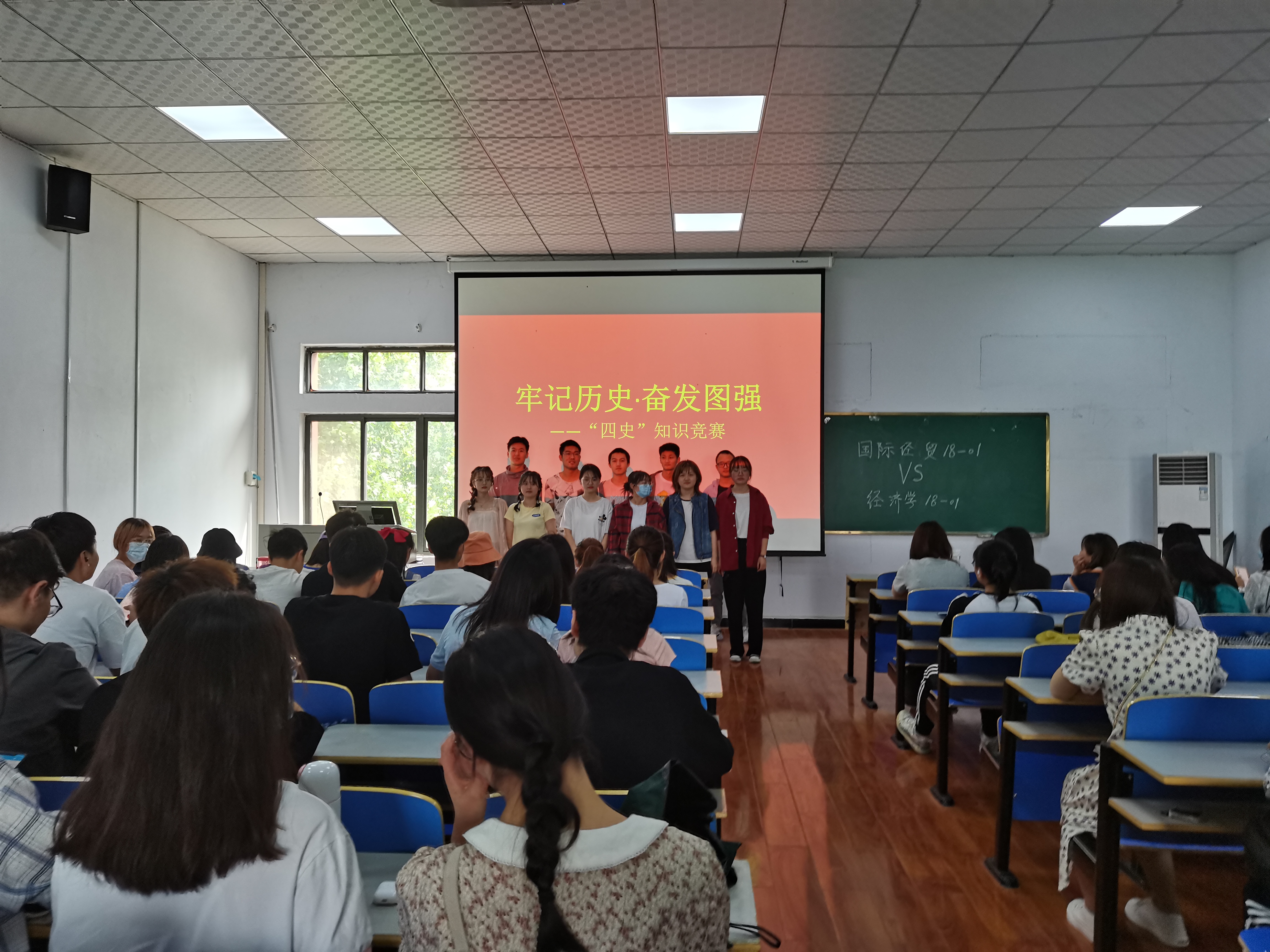 为庆祝中国共产党百年华诞传承红色基因,经济与管理学院经济学1801班和国际经济与贸易1801512下午5在禹州校区举办《牢记历史、奋发图强—“四史知识竞赛》。