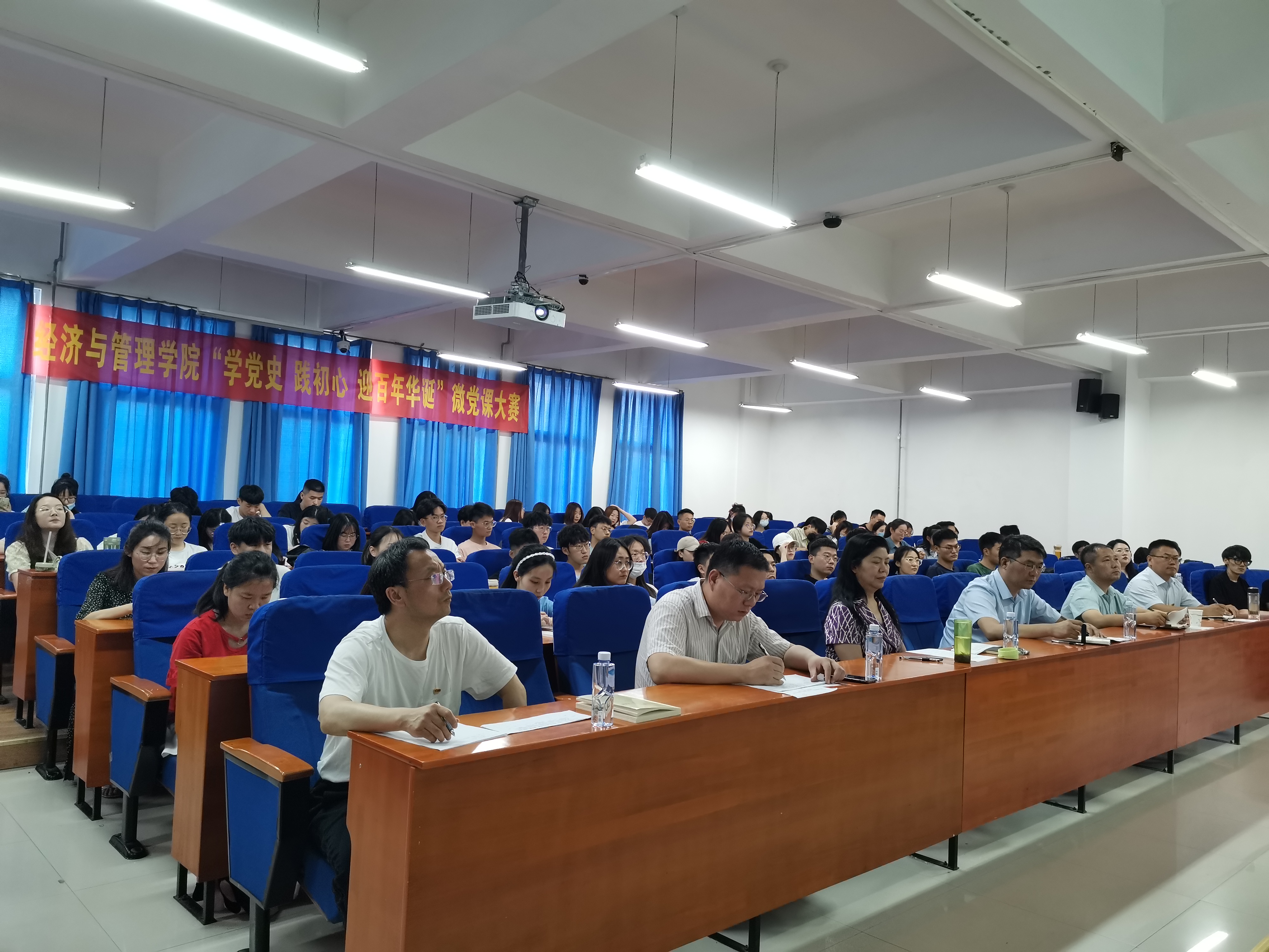 为贯彻落实习近平总书记在党史学习教育动员大会上的重要讲话精神,深入推进党史学习教育,隆重庆祝中国共产党成立100周年,6月7日下午经济与管理学院党委在经管楼211教室举办了“学党史 践初心 迎百年华诞”教工党员微党课大赛。大赛评委由学校相关部门负责人、兄弟学院党组织书记和经济与管理学院党政领导担任,180余名师生党员代表和入党积极分子现场观看了比赛。