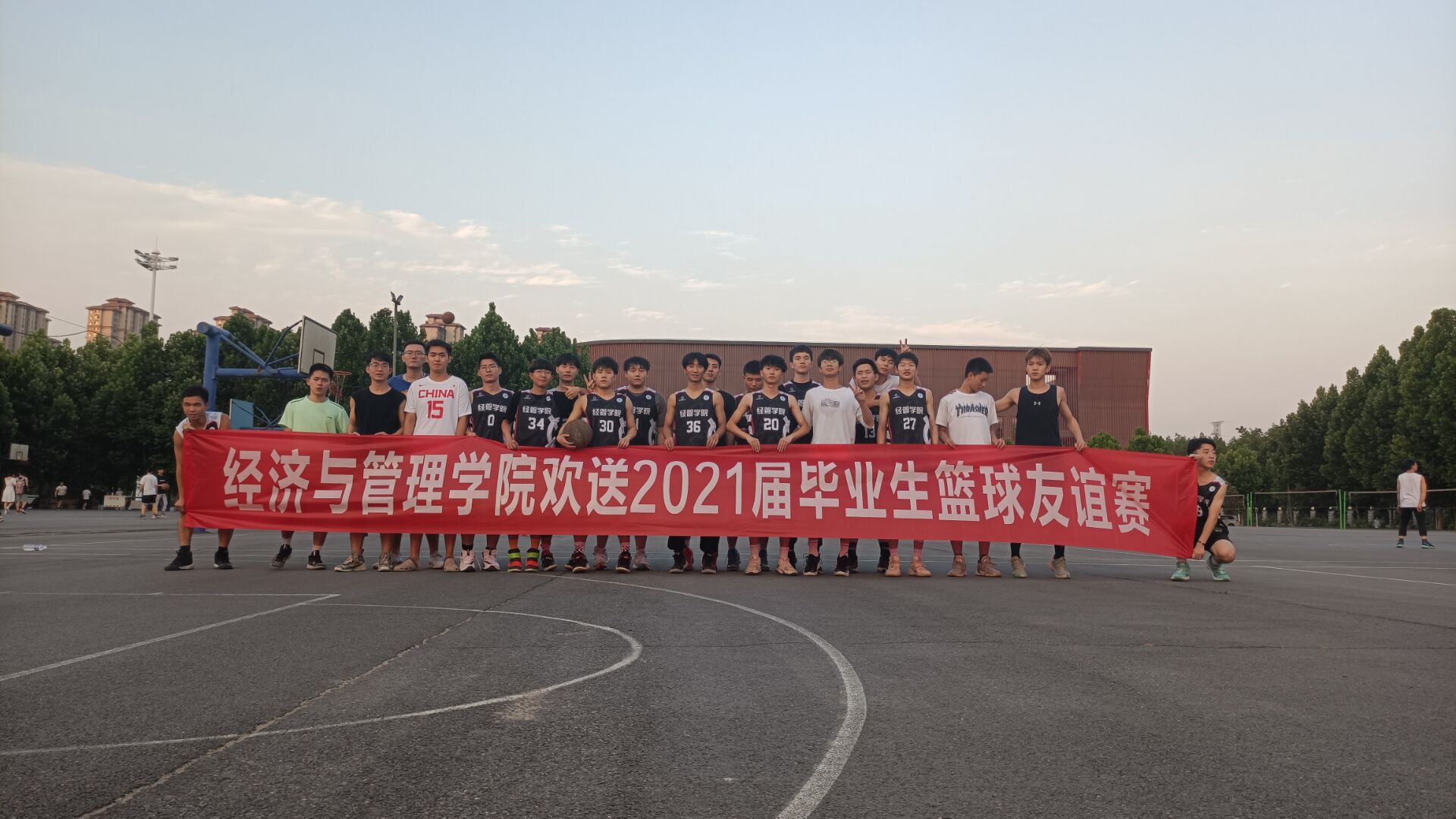 为送别即将离开校园、踏上新征程的2021届毕业生,增进同学感情,营造文明温馨的毕业生离校氛围。经济与管理学院于2021年6月22日,在南门篮球场开展送毕业生篮球赛活动。学院篮球队队员和部分2021届毕业生参加本次活动。