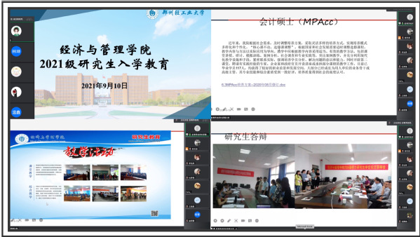 为了做好2021级研究生入学教育工作,引导研究生新生厚植爱国情怀,尽快适应和规划好研究生期间的学习和生活,9月10日上午8点30,经济与管理学院召开2021级研究生线上入学教育会,学院党委副书记陈章美,副院长张梅出席了此次会议,MBA和MPAcc项目中心教学管理部彭青秀主任、梁峰老师,研究生管理办公室崔亚娟主任、邢艺贤老师及2021级研究生参加了此次会议。会议由副院长张梅主持。