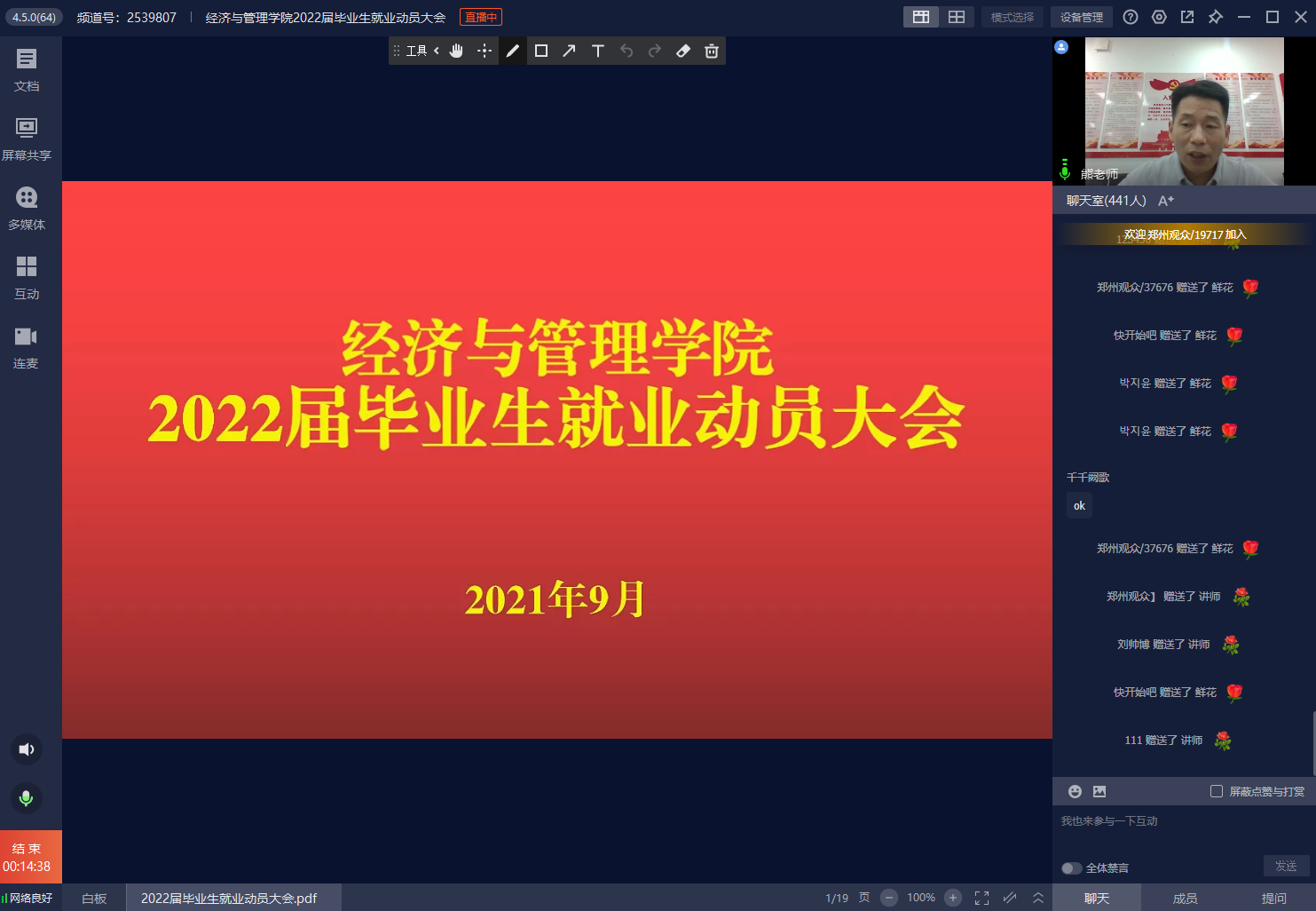 为进一步增强毕业生就业意识,引导毕业生了解就业形势,树立正确的就业观和择业观,9月29日,经济与管理学院通过线上会议平台召开2022届毕业生就业动员大会。学院党委副书记陈章美、就业专职老师熊苗以及我院2022届全体毕业生参加了本次会议。