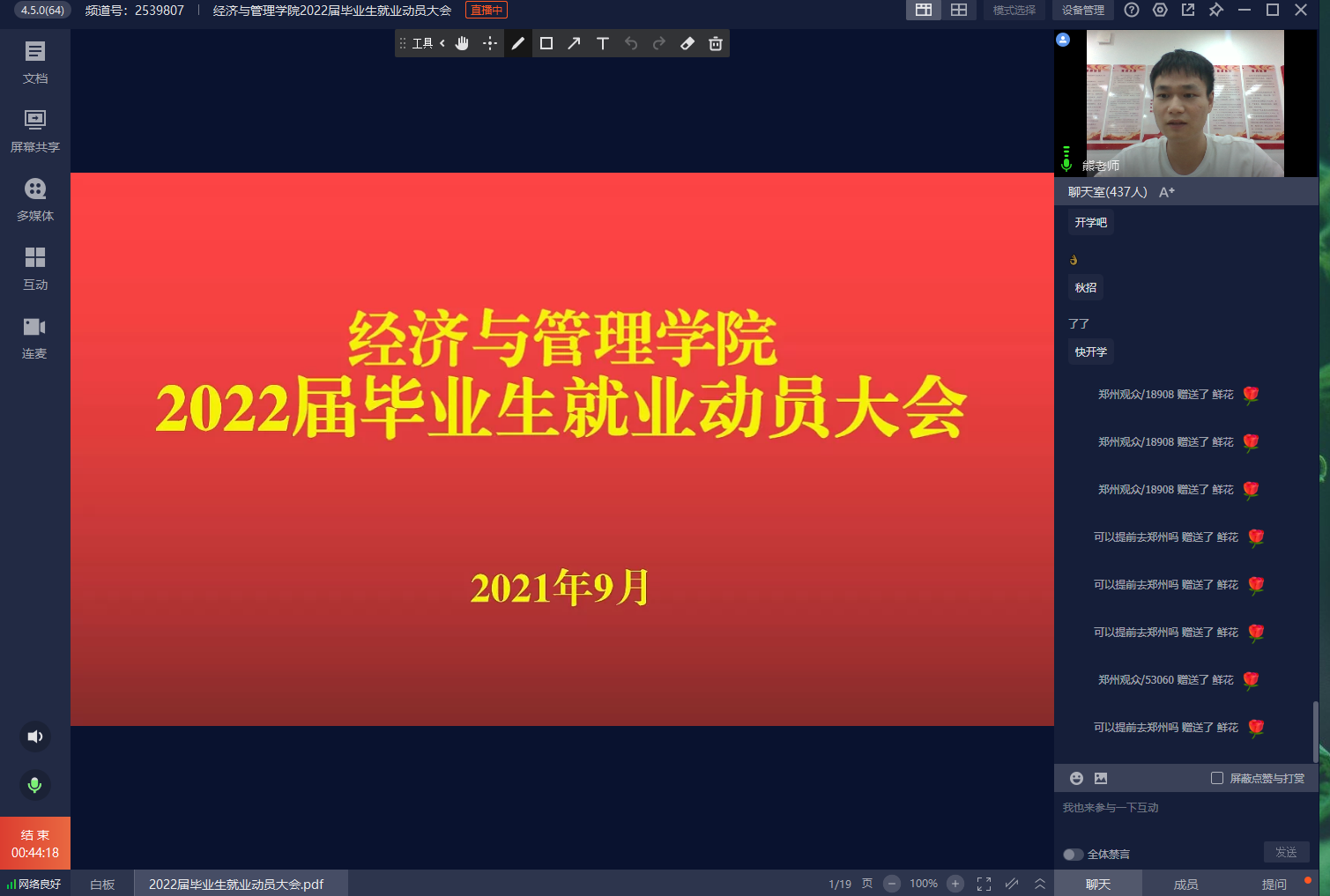 为进一步增强毕业生就业意识,引导毕业生了解就业形势,树立正确的就业观和择业观,9月29日,经济与管理学院通过线上会议平台召开2022届毕业生就业动员大会。学院党委副书记陈章美、就业专职老师熊苗以及我院2022届全体毕业生参加了本次会议。