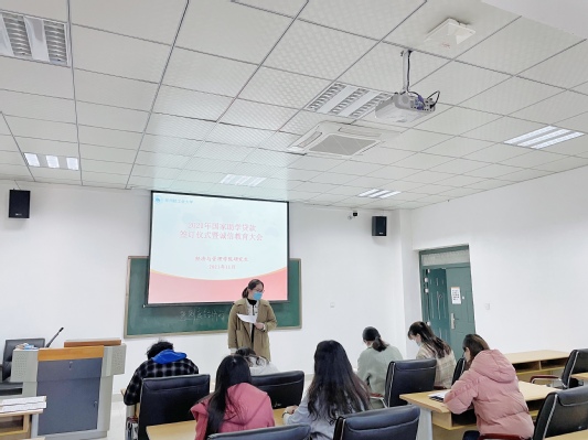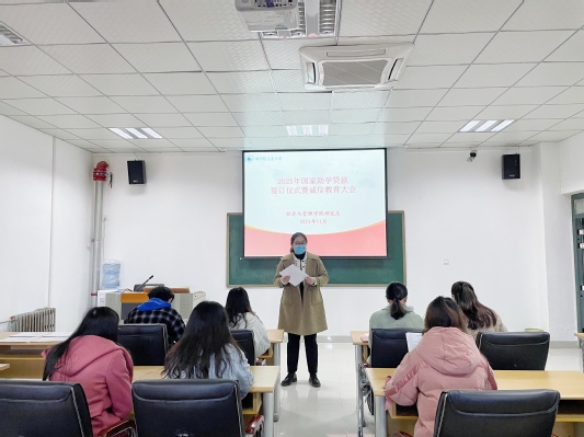 为宣传和落实好国家资助政策,保证我院2021年国家助学贷款工作顺利进行,进一步加强对学生诚信教育,2021年11月10日下午,经济与管理学院崔亚娟和邢艺贤老师组织我院全体申请国家助学贷款研究生在经管楼310教室召开研究生2021年国家助学贷款签约仪式暨诚信教育大会。