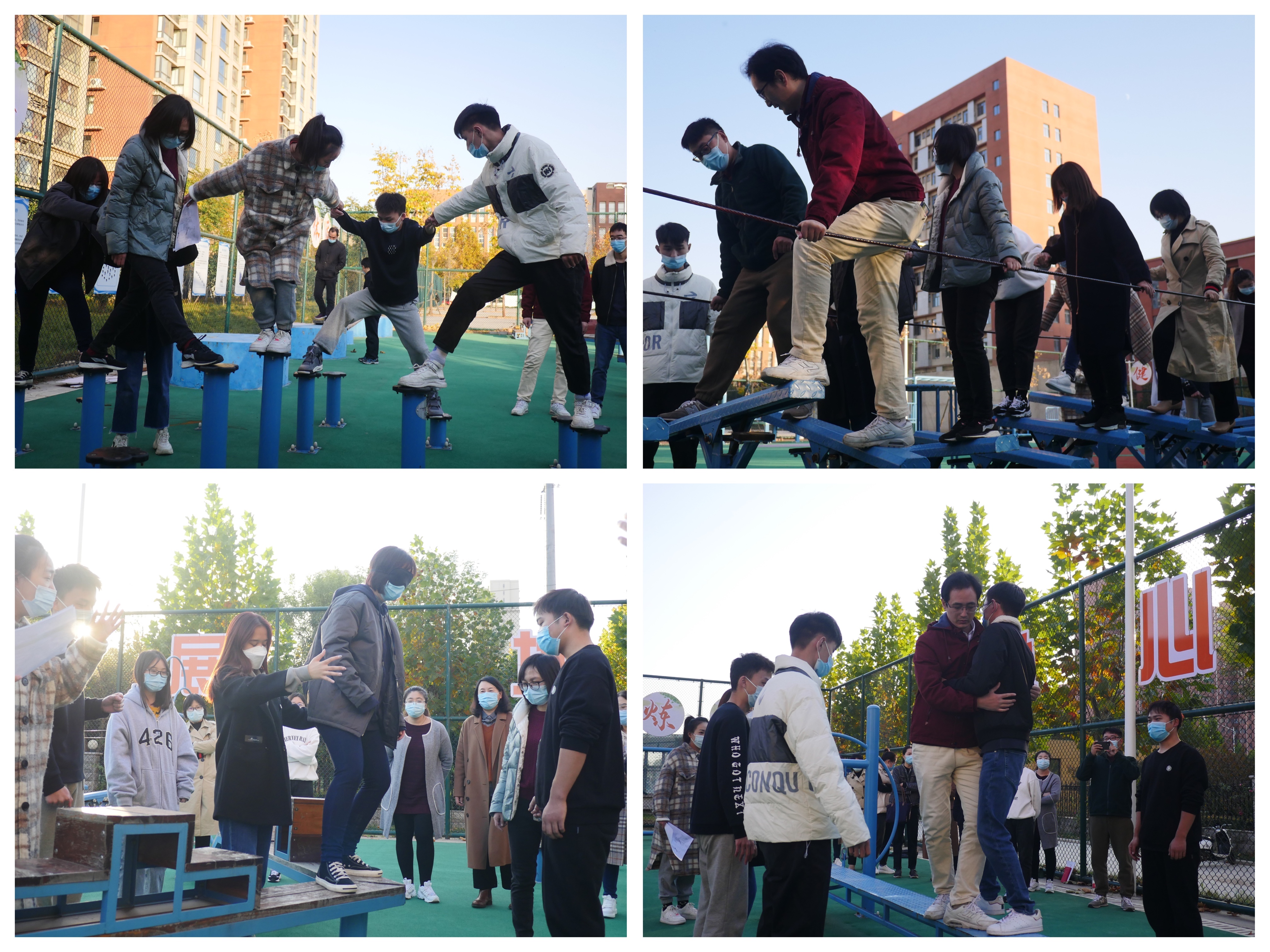 会上,陈章美副书记提出以下几点工作要求:第一、重视学生安全稳定工作,老师们应及时提高安全防卫意识,通过开展各类安全主题班会,为班级学生做好安全问题的预警工作,就当下各类具体的安全隐患向老师们做了详细阐述第二、班主任加强与辅导员之间的沟通,时刻关注学生的学习状态生活状态和心理状态,进一步搭建与学生沟通的桥梁。第三、重点关注考研学生的学业焦虑和升学压力等问题,及时做出正确引导,以谈心谈话等方式对其缓解压力,并在最后考研冲刺阶段给予鼓励。第四、做好大一新生学业指导工作,摆脱开学之初的学业迷茫状态,及时调整自我状态帮助同学们树立明确目标,规划未来发展路线,进行考研的恰当引导。论坛第一部分结束之后,老师们来到了我校室外心理素质拓展基地,在心理专职辅导员的带领下,共同完成了“盲目障碍”、“礼让通行”、“携手并进”等互动项目,增强大家的团队合作精神,培养人际信任感和自我挑战的精神和能力,同时也增进了老师们之间的感情交流。老师们积极踊跃的参与到活动中来,现场气氛浓烈欢声一片。