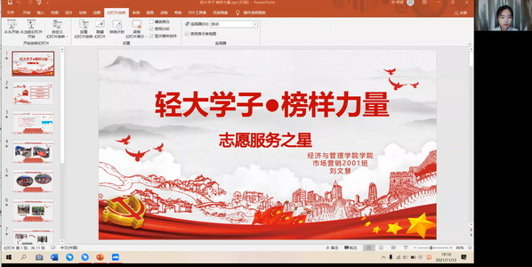 为深入学习贯彻习近平新时代中国特色社会主义思想,落实立德树人根本任务,深入挖掘和宣传我校大学生先进典型事迹,充分发挥先锋示范引领作用,进一步推动我校优良学风建设,激发广大学生坚定信念。经济与管理学院于11月14日晚7点举办了“轻大学子·榜样力量”评选展示活动,学院各年级学生代表通过腾讯会议进行线上观看。