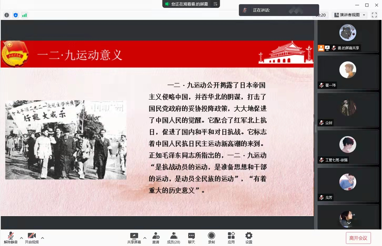 本次活动以“铭记一二·九精神 接力一百年复兴”为主题。首先,主持人介绍了“一二·九”运动的背景和意义,重温先辈们经历过的光辉历史,倡导大家铭记“一二·九”精神,把爱国情怀贯彻到生活的方方面面。接下来,通过观看相关视频,同学们进一步了解一二·九运动的相关历史,体会学习了革命先辈的伟大奋斗精神。最后,与会同学分享了自己对于“一二·九”运动精神的理解和心得体会。经济学2102班曹永芳同学认为,作为新时代青年,不仅要在思想上爱国,更要在行动上爱国,铭记历史、奋发有为,迎难而上、披荆斩棘,真正做到强国有我。同学们纷纷响应,表示要认真学习党史,继续和发扬爱国主义精神,在实现中华民族伟大复兴中国梦的光辉历程中勇担青春使命,努力奔跑,奋力追梦。