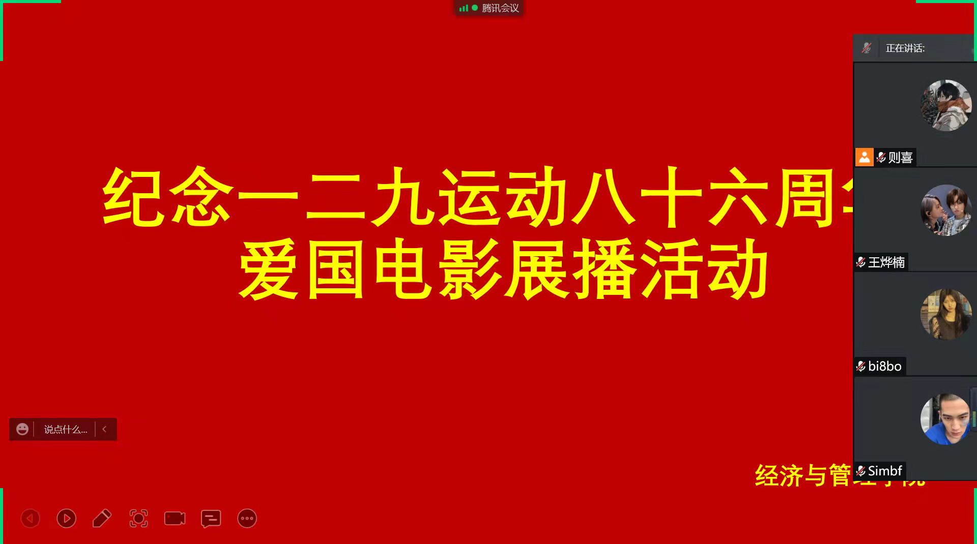 为纪念“一二·九”爱国运动八十六周年,进一步加强和改进大学生思想政治教育和丰富党史学习形式,弘扬爱国主义精神,丰富校园文化生活。经济与管理学院于11月27日下午3点举办纪念“一二·九”运动86周年之爱国电影展播组织我院青年学生共同观看红色电影《1921》,百余名学生通过腾讯会议进行线上观看。