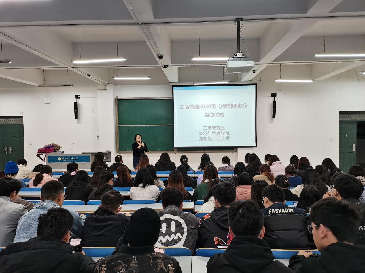 20211129日下午1630,经济与管理学院工商管理系谢芳老师和邢慧琼老师带领2020级工商管理专业76名学生于经管楼309室举行经典阅读开班仪式。