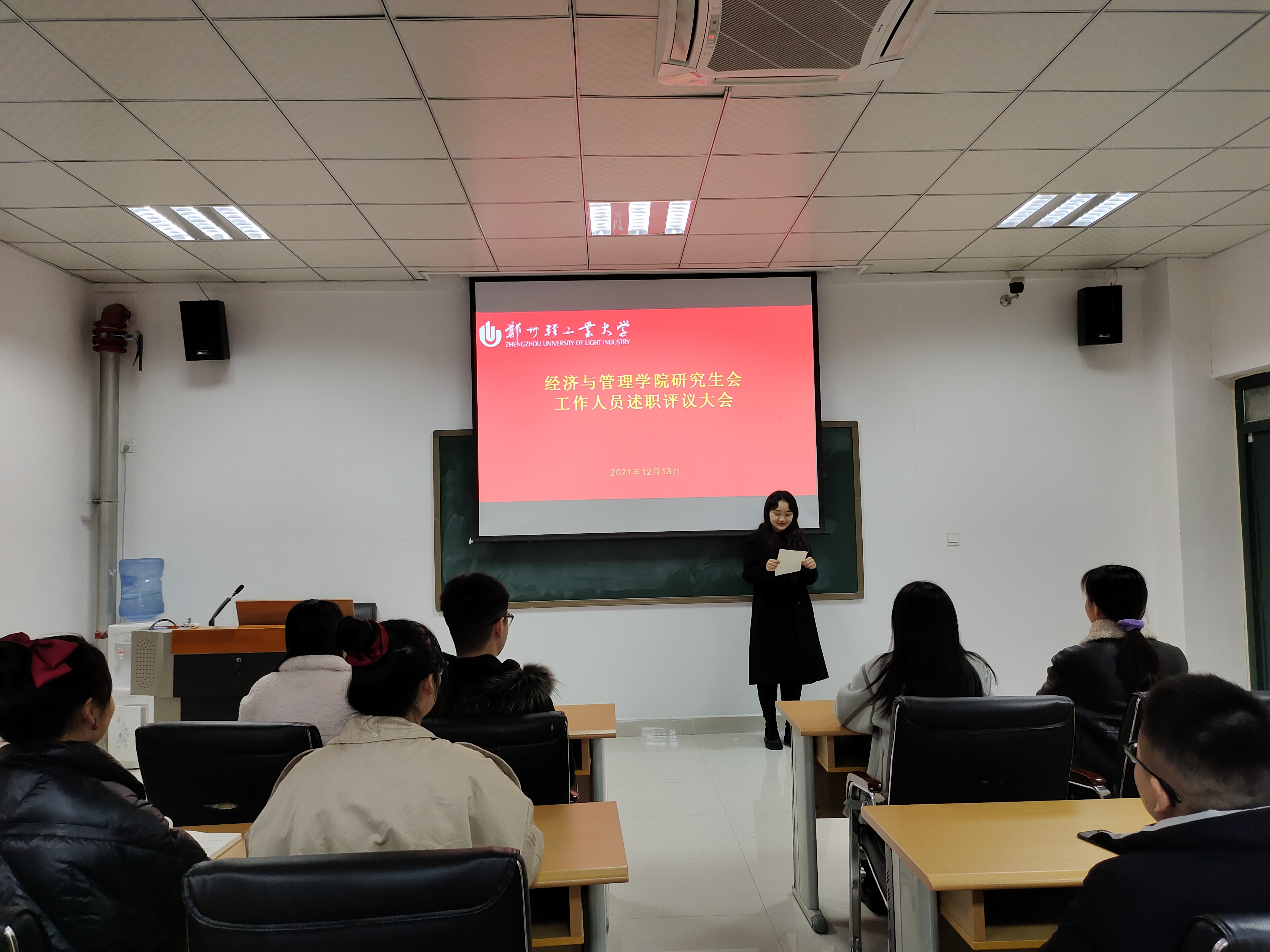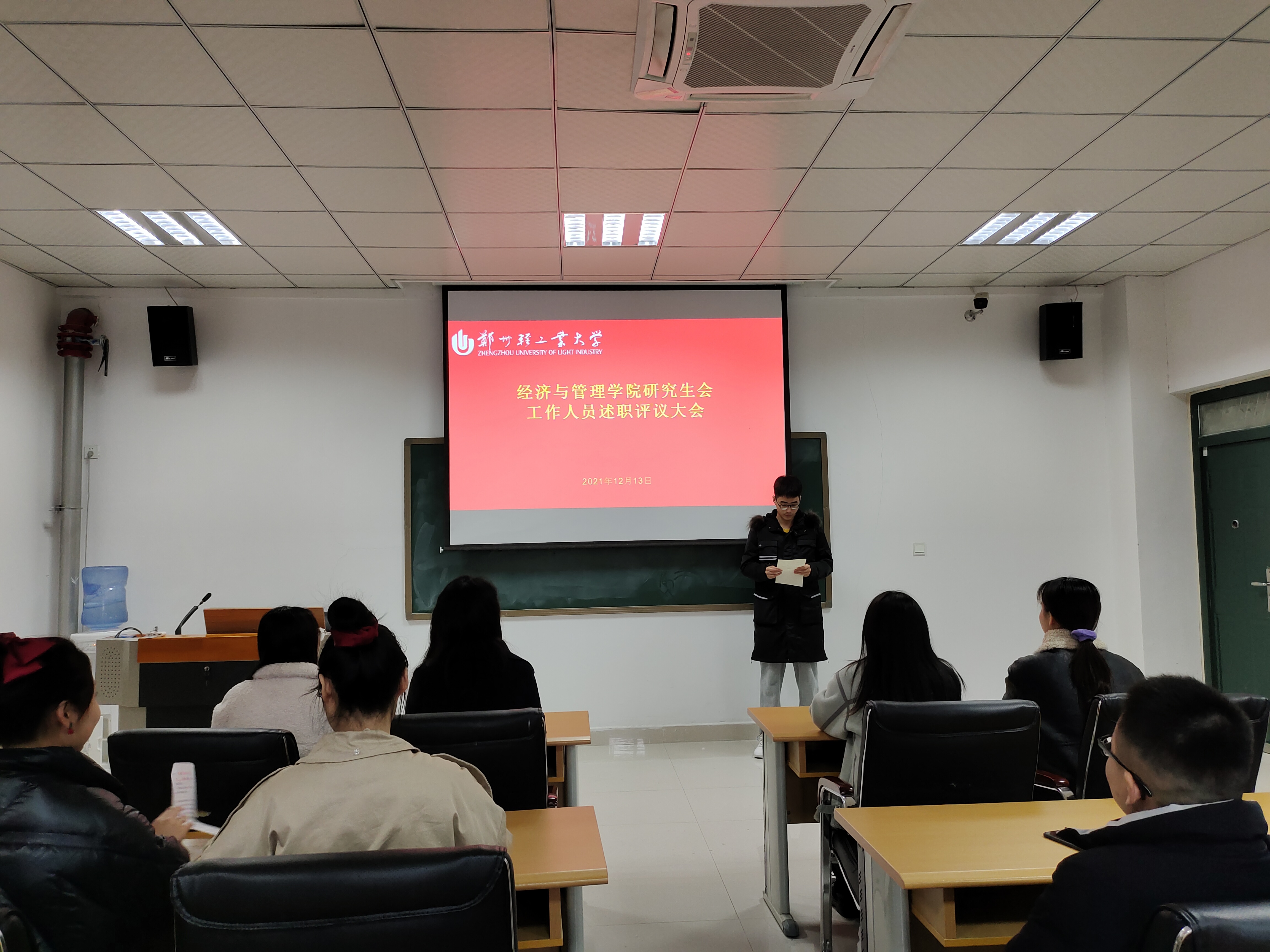 为了深入贯彻落实习近平新时代中国特色社会主义思想,促进学生组织工作制度化、规范化,更好地履行学生组织工作职责,服务青年学生成长,经济与管理学院研究生会述职评议大会于2021年12月13日中午,在科学校区经管楼310教室顺利召开。