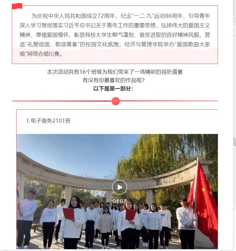 为纪念“一二·九”爱国运动86周年,引导团员青年深入学习、贯彻落实习近平总书记关于青年工作的重要思想,弘扬伟大爱国主义精神,厚植爱国情怀,彰显我校学生朝气蓬勃、奋发进取的良好精神面貌,营造“礼赞祖国、歌颂青春”的校园文化氛围,经济与管理学院于2021年11月11日--12月14日举办“爱国歌曲大家唱”线上大合唱比赛。