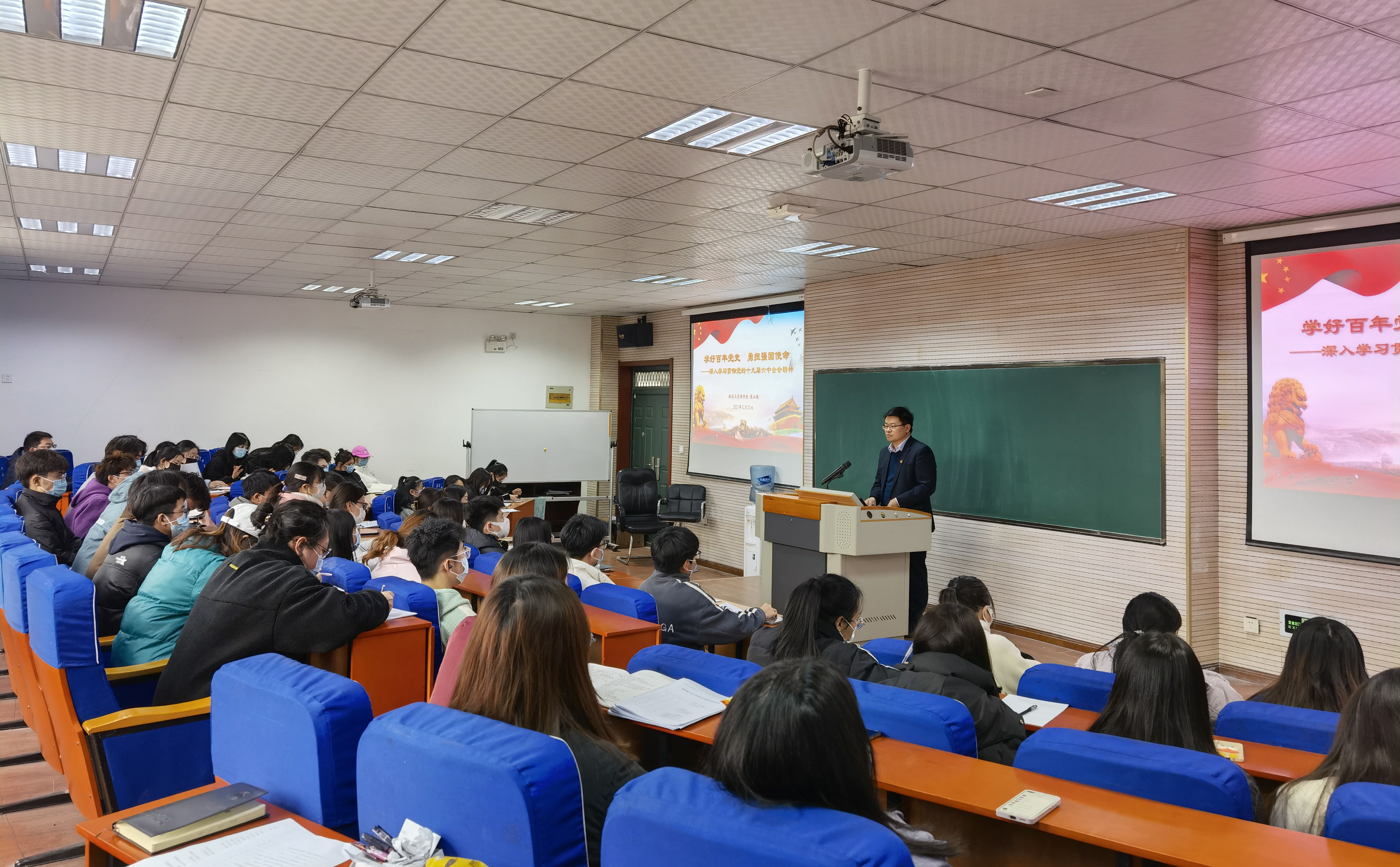 为深入学习贯彻党的十九届六中全会精神,教育引导青年大学生深刻认识党的百年奋斗重大成就和历史经验、牢固树立唯物史观和正确党史观、勇担新时代强国使命,12月23日下午,经济与管理学院党委书记张云超以《学好百年党史 勇担强国使命》为题,在科学校区经管楼311教室为学生讲授专题思想政治课,学院各学生党支部党员代表、青马班学员以及部分学生干部现场聆听了思政课。