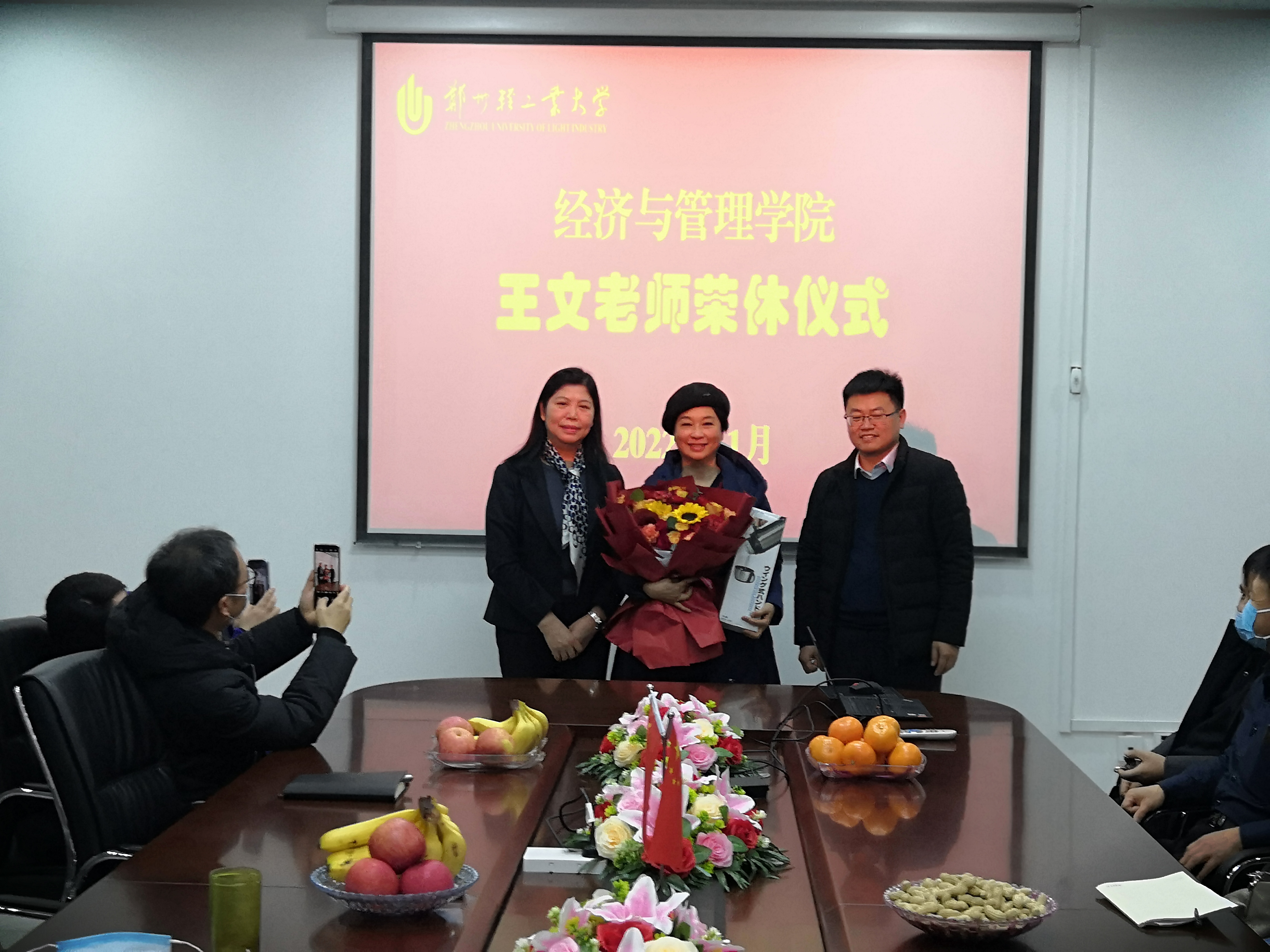 1月6日中午,经济与管理学院在经管楼219会议室为退休教师王文老师举行荣休仪式。仪式由学院党委副书记、工会主席陈章美主持,学院领导班子成员和教师代表近20人参加活动。