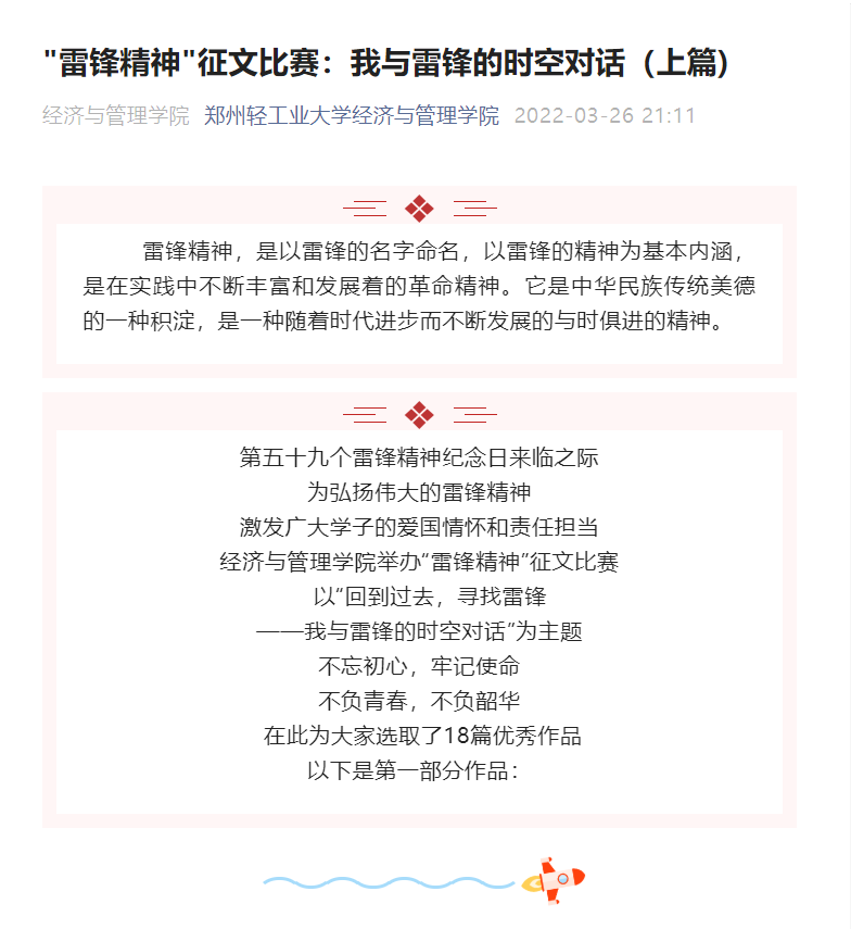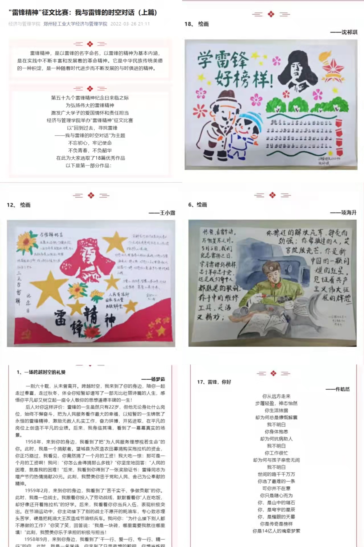 在第59个学习雷锋纪念日来临之际,为弘扬雷锋精神,进一步引导学生了解“人人争先,乐于奉献”的雷锋精神,激发同学们的写作热忱,展现经管学子奉献友爱、互助进步的精神面貌。经济与管理学院于3月15日-30日期间举办了“回到过去,寻找雷锋——我与雷锋的时空对话”主题征文比赛。