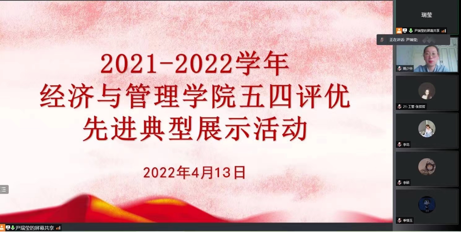 为深入贯彻落实习近平总书记关于青年工作的重要思想,充分发挥五四先进典型示范引领作用,以优异成绩迎接建团100周年和党的二十大胜利召开,经济与管理学院于4月13日晚上7点开展“五四”评选答辩暨先进线上展示活动。