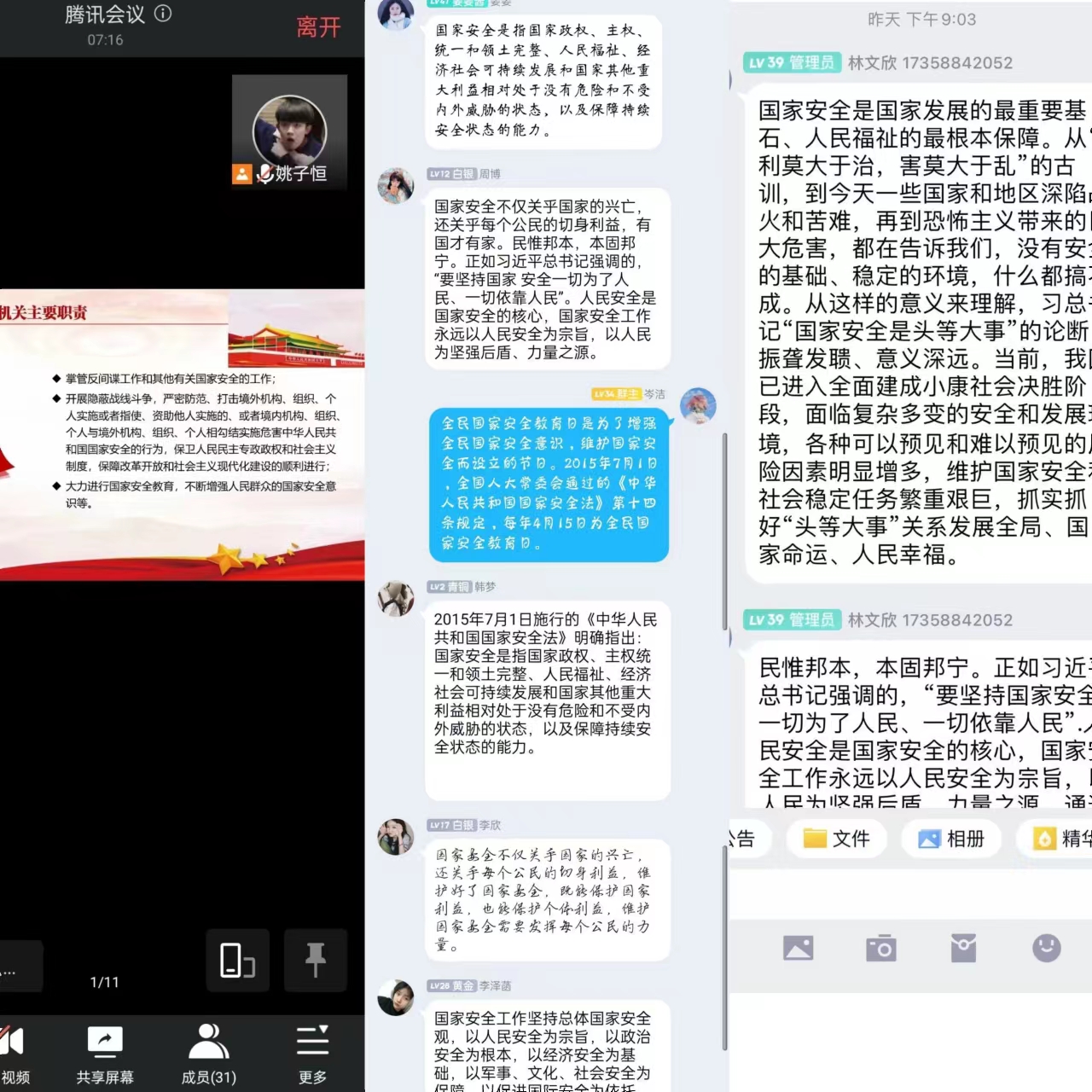 各班积极响应学院号召,在团支书的带领下召开国家安全主题班会,团支书向同学们讲述国家安全教育日的由来、内容、危害国家安全的行为及相关罪名、如何维护国家安全等方面的知识,并展示了新中国成立以来犯罪分子为谋取个人利益而出卖国家利益最终被绳之以法的种种案例,为同学们敲响警钟。活动期间,学院还通过官Q、官博等大力宣传国家安全知识和国家安全法律法规有关内容,有利于提高学院师生对国家安全法的了解,增强师生的爱国意识,营造良好的宣传舆论氛围。此外,学院还对学生开展了安全预防教育,使学生能够接受比较系统的防溺水、防交通事故等安全知识和技能教育,对安全事故有充分的认识,从而提高广大学生的安全意识、安全防范能力和自我保护能力。
