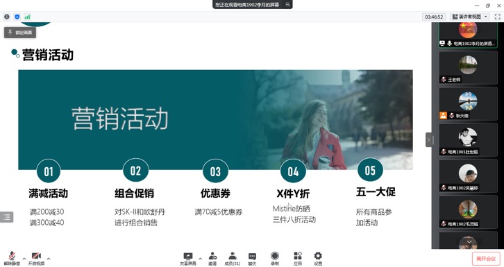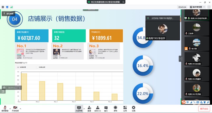 2022年4月18-29日,经济与管理学院电子商务专业19级56名同学完成了为期2周的跨境电商店铺运营实训。 本次实训活动举行了19场实训专题。主要内容包括跨境电商平台操作、电商视觉营销设计、通关服务平台操作、电商大数据分析、跨境电商保税仓业务等。4月29日下午实训同学在线进行了成果汇报。 本次实训,同学们以店铺店长角色进行产品分析、详情页制作、营销设置、客户服务等业务实践,全流程体验跨境店铺运营。通关本次实训,同学们巩固了专业知识,提升了实践动手能力,为后续个人发展打下坚实的基础。