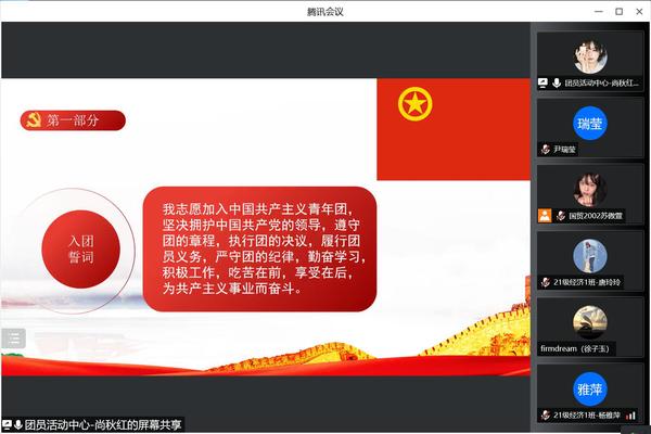 活动伊始,主持人尚秋红带领同学们重温入团誓词,强调了共青团员要担当起青春使命,增强团员意识,增强三个自信,坚定信仰信念。紧接着,主持人带领同学们从共青团在新时代的基本任务、组织原则、改革开放和现代化建设事业的深入发展对共青团工作提出更高要求这三个方面让广大团员青年更加深刻地了解共青团的发展奋斗史。在分享感悟环节,一位同学分享到:“通过此次活动,我认识到作为新时代的青年,光荣的共青团员,更应该严于律己,宽以待人,努力学习科学文化知识,德智体美劳全面发展,为共青团的发展蓄力。”活动最后,主持人引领同学们共同在团旗下唱响团歌,唱响青春!