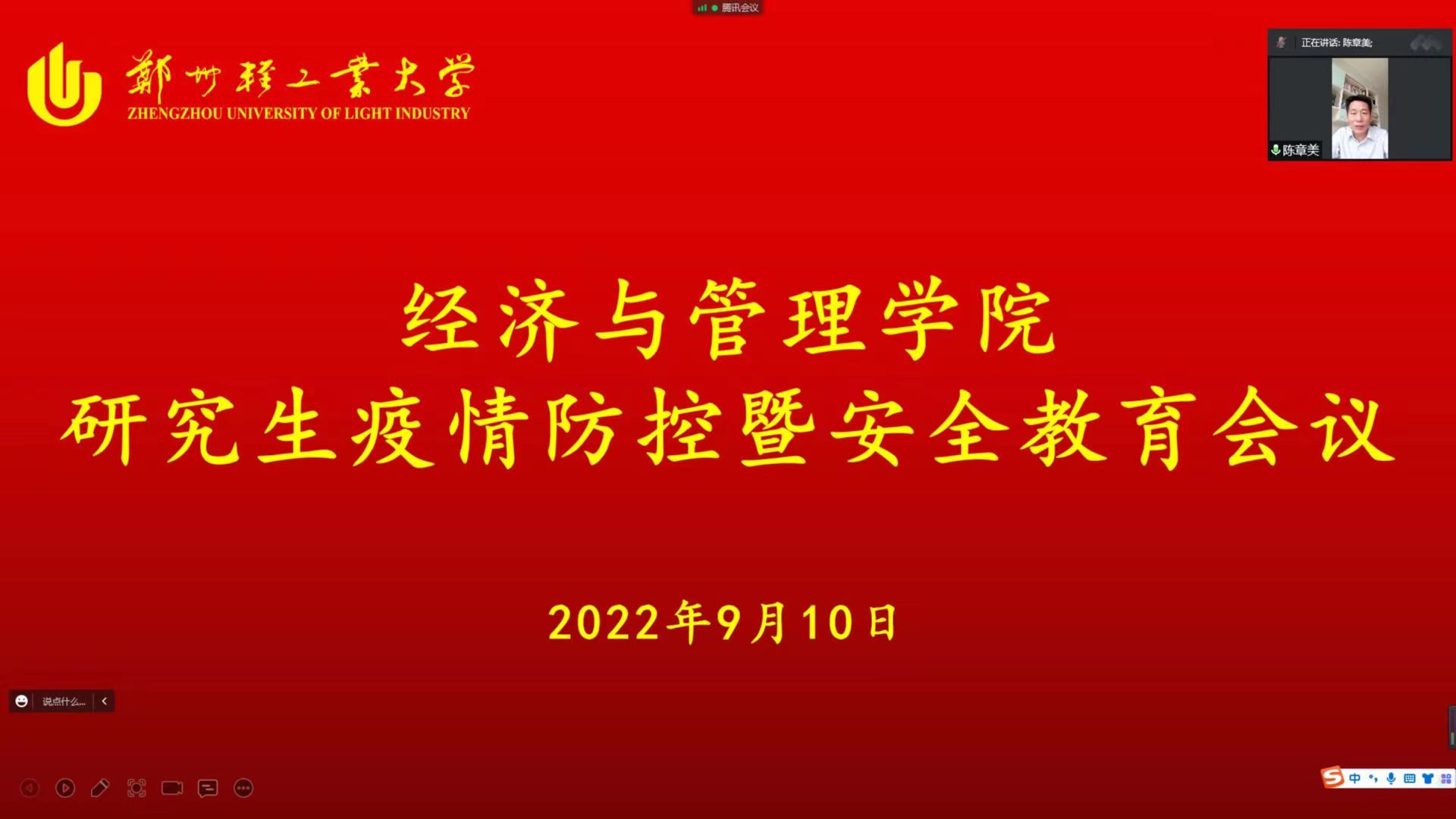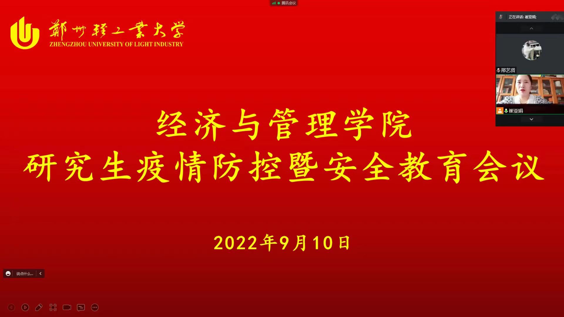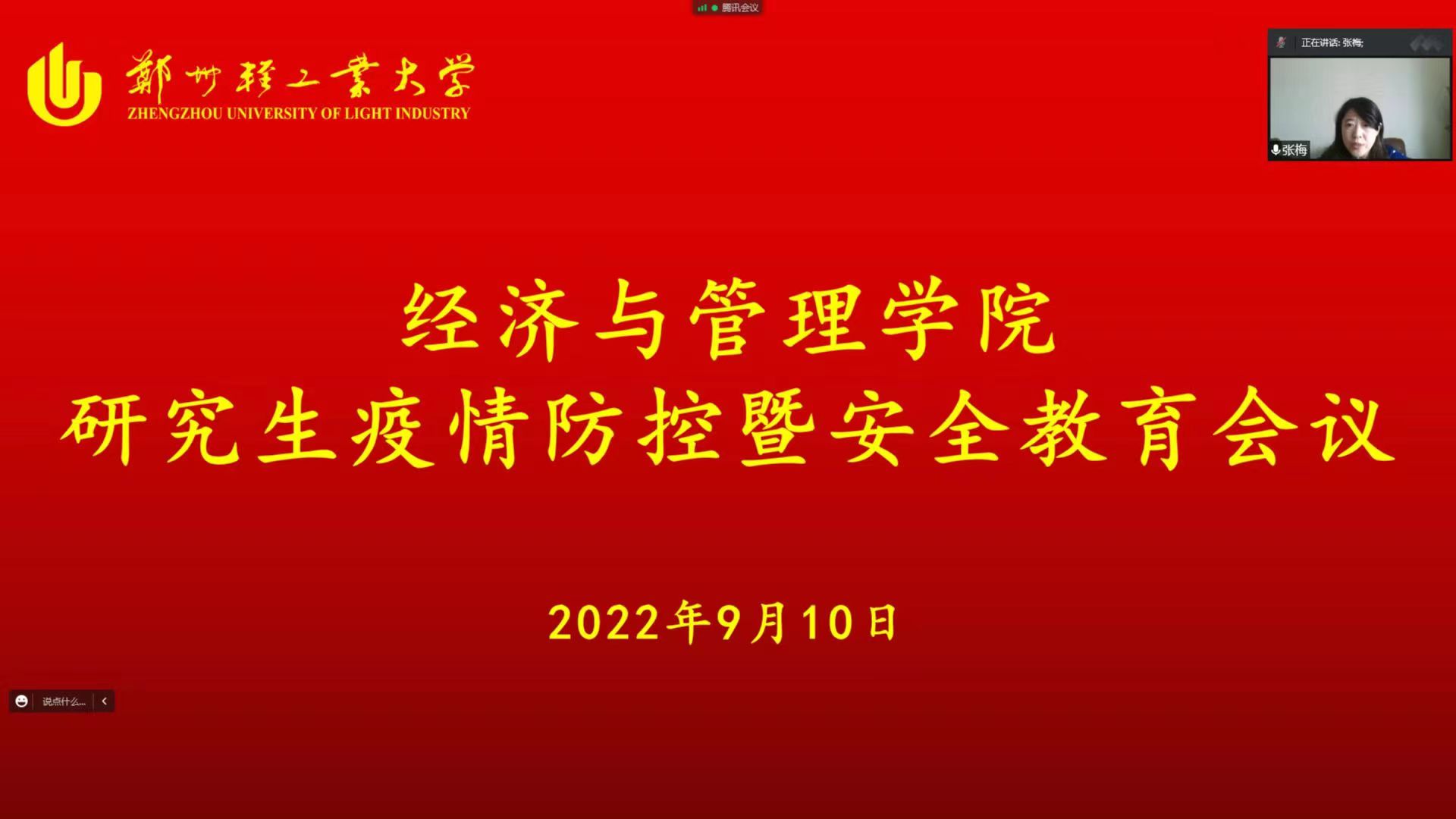为进一步落实上级疫情防控政策及学校疫情防控的有关规定,切实筑牢安全防线,9月10日上午10:00,经济与管理学院通过腾讯会议召开了研究生线上疫情防控暨安全教育会。学院党委副书记陈章美、副院长张梅、研究生辅导员及全体研究生参加了会议。会议由学院研工办主任崔亚娟主持。