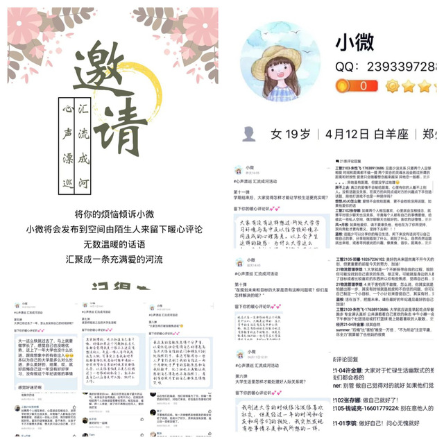 本次活动以帮助同学们排忧解难,互相鼓励为主旨,同学们将自己的烦恼、焦虑和心事匿名发送给小微。小微通过聆听倾诉者的心事,用提前准备好的暖心故事、生活经验帮助倾诉者排解烦恼,并将其匿名发布到QQ空间。而倾诉者们在QQ空间的评论区,同样也收到了来自陌生人留下的暖心评论和鼓励,例如:“你不是一个人,我们与你同行”、“你也是人间天使”、“你并不孤独”、“美好虽会迟到,但一定会到来”、“总有人爱着现在的你”、“我们都不会被亏待”。这些话语,给予了倾诉者温暖的关怀,让倾诉者感受到自己并不孤单,让他们体会到自己也沐浴在被爱的阳光下,引导倾诉者走出低落的情绪,摆脱负面情绪的影响。