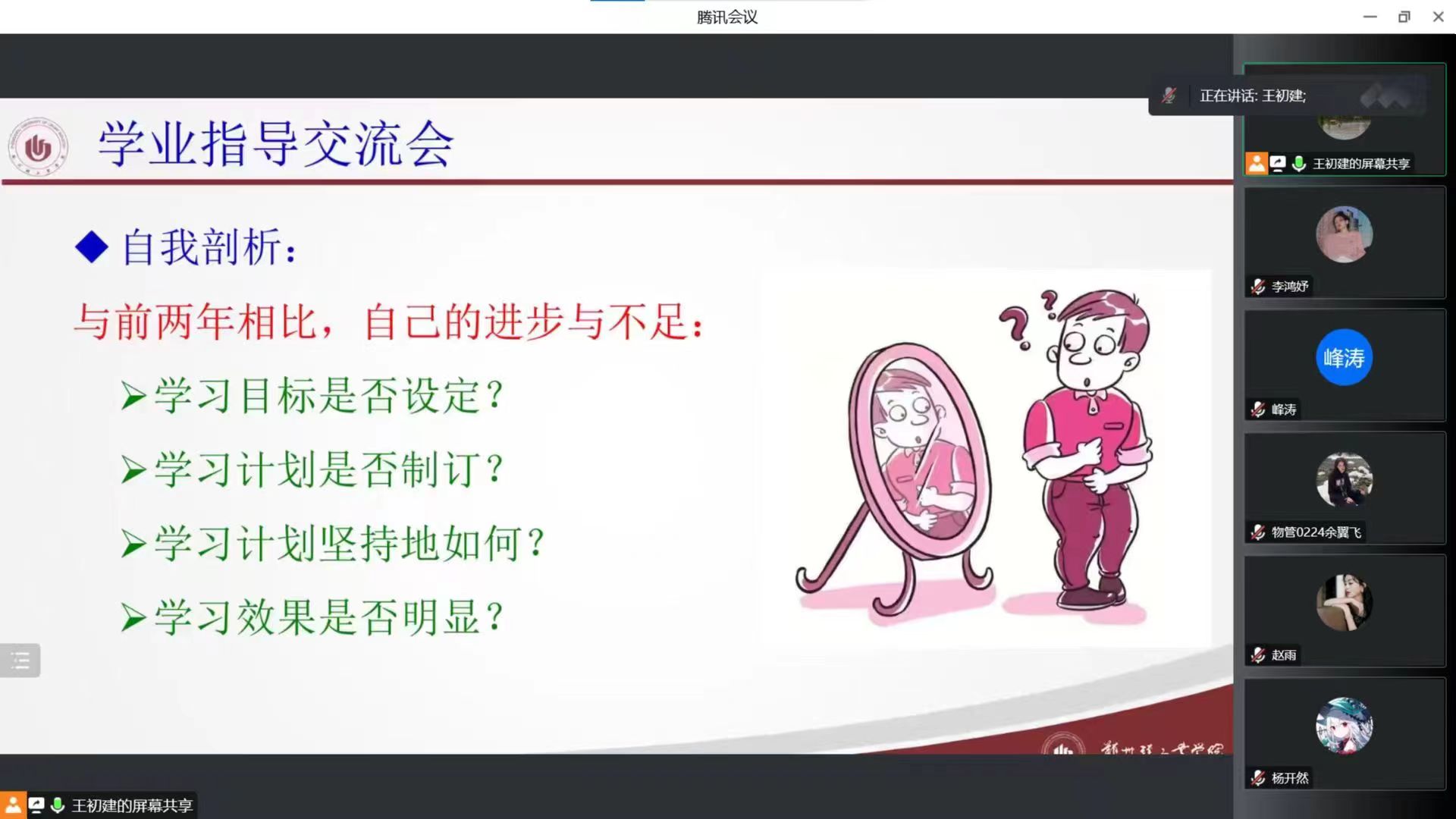 班主任们从疫情防控形势、学习规划、课业指导、考研经验交流等多方面开展了各具特色的指导会,勉励引导学生积极学习,调整心态、克服困难,合理安排自己的学习生活。他们就同学们提出线上教学中的问题与感受进行了疏导与了解,指出当下是一个很好的学习机会,可以利用这段时间来提升自己。建议大家以宿舍为单位,组成学习小组,共同学习,抵抗拖延症;在校期间尽可能有效利用学校资源,有机会就多参加各类学科竞赛等,提升综合实力和专业素养;在继续升学还是工作之间做好选择,制定好目标并为之不懈努力;在学习巩固专业知识的同时,多多开阔视野,多读书,为毕业论文做准备,调整心态做好考研复习冲刺阶段身心保障。班主任们还倡导同学们无论是在校还是居家学习,都要积极化解心理危机,转移注意力,发展自己的兴趣爱好,把握机会在不影响其他同学的前提下多锻炼身体,切勿沉迷电子竞技游戏。