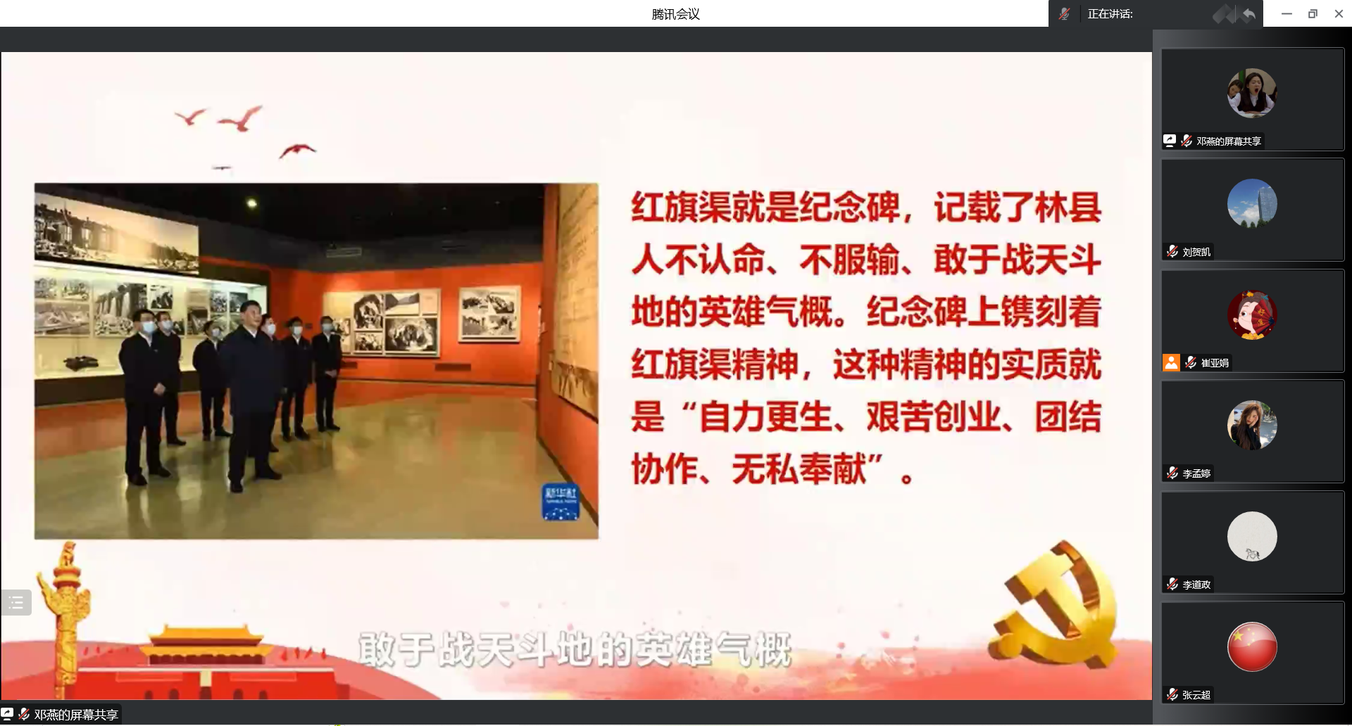 会上,崔亚娟老师带领大家学习了习近平总书记在河南安阳考察时的重要讲话精神,观看了思政微课《红旗渠精神永在》、《红旗渠纪念碑》。随后,与会党员围绕学习贯彻习近平总书记视察安阳重要讲话精神和党的二十大精神以及在新时代如何传承弘扬红旗渠精神,结合各自学习生活实际,进行交流发言。大家谈认识、讲体会、找差距、明方向、表决心,讨论异常热烈。大家一致认为,“自力更生、艰苦创业、团结协作、无私奉献”的红旗渠精神至今仍然具有重要的时代价值。红旗渠精神的出发点和落脚点就是实干、苦干。新时代新征程,研究生党员要传承红色基因,赓续红色血脉,开拓创新、砥砺前行,做有理想、敢担当、能吃苦、肯奋斗的新时代好青年。