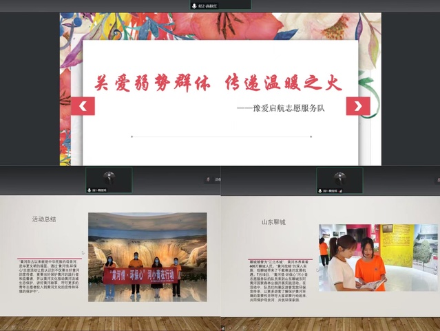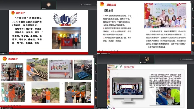 此次总结大会在线强调实践需要关注的细节,并邀请实践队成员分享经验。首先,主持人就学院2022年暑期社会实践活动的开展情况进行了简要介绍,通过视频带领大家回顾了暑假期间学院学生积极响应团省委、校团委号召,向社区(村)报到,踊跃投身于社区疫情防控、抗洪救灾等社会实践活动中的志愿行为。在本次活动中,“红鹰轻青”志愿服务队志愿队员们结合自身专业知识和调研结果,先后在信阳市付店镇、商丘市永城市和平顶山市叶县开展志愿服务活动协助解决农村电商的发展状况和面临的困境,为乡村振兴贡献了一份属于自己的青春力量;“黄河情·环保心”河小青志愿服务队,向市民及游客宣传黄河流域文明发展、水患治理、生态保护等历史变迁,引导其树立正确历史情感和环保理念;“豫爱启航”志愿服务队积极响应学生关爱孤寡老人与留守儿童的号召,去往信阳市付店镇小学、淅川县寺湾镇康德幼儿园及康德老年公寓进行志愿活动,让当地的老人和小朋友感到了温暖和关爱。最后,同学们纷纷表示要更加积极投身于实践活动中去,为社会贡献出自己的一份力量。