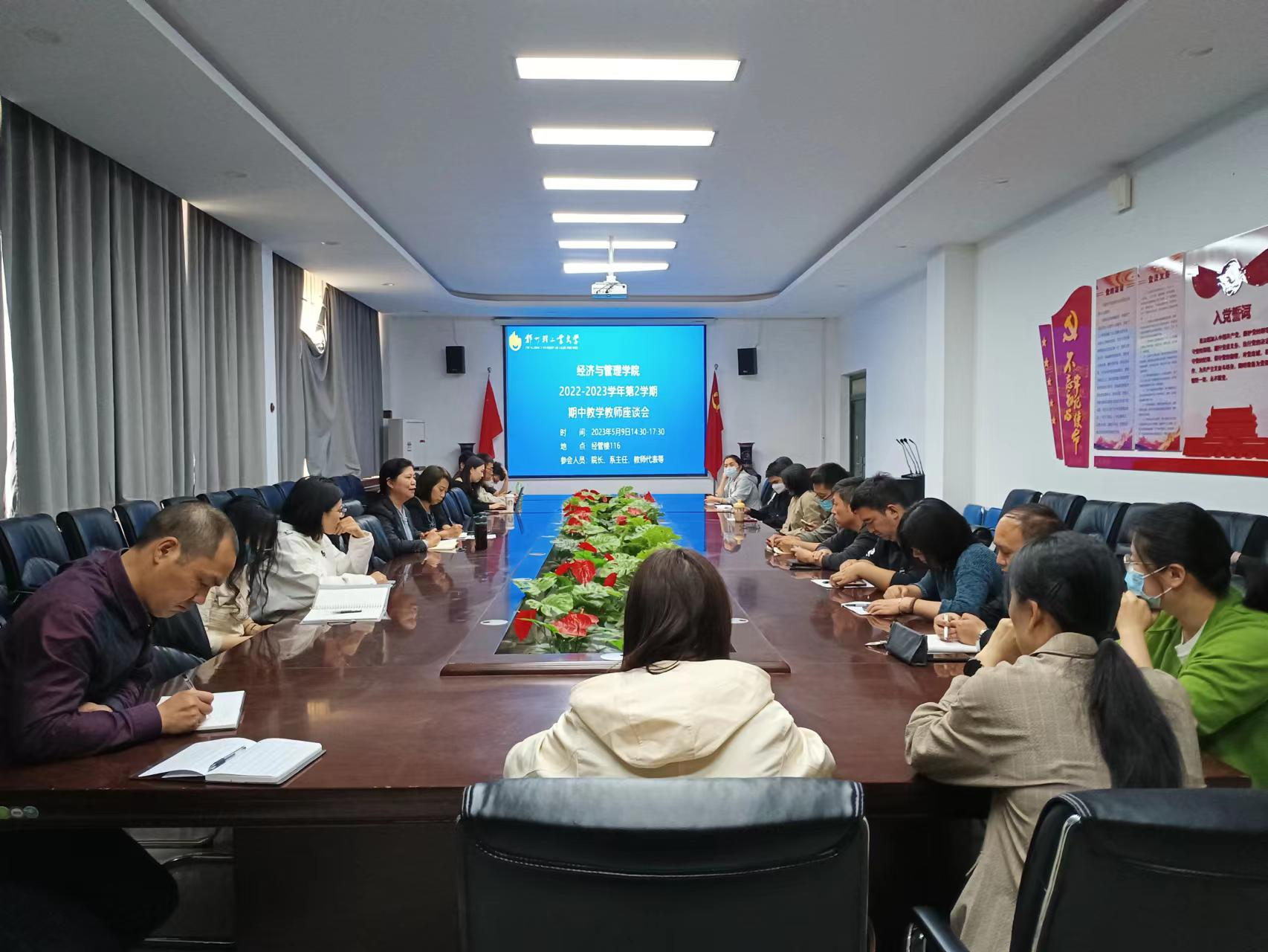 5月9日下午14:30-16:30,经济与管理学院在经管楼116会议室召开了2022-2023学年第2学期期中教学教师座谈会,刘珂院长、各系主任和教师代表参加了此次座谈会,座谈会由副院长安慧主持。