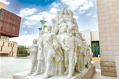 图为中国共产党历史展览馆前主题雕塑《伟业》。这组群像人物姿态以“奋力前行”和“挺拔站立”为主,通过人物和道具等元素的组合,形成局部场景,凸显了“扶贫攻坚”“援外维和”“建设绿水青山”等新时代成就,反映了广大人民群众在中国共产党的领导下团结奋进、继往开来,开创中国特色社会主义伟大事业的壮阔历史场景。(图片来源:人民视觉)