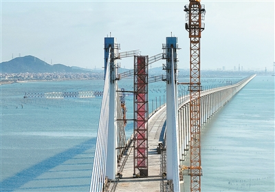 11月13日上午,福建泉州,中国首条跨海高铁——新建福(州)厦(门)铁路湄洲湾跨海大桥成功合龙。大桥建成后,我国高铁将迈入跨海时代。(图片来源:视觉中国)