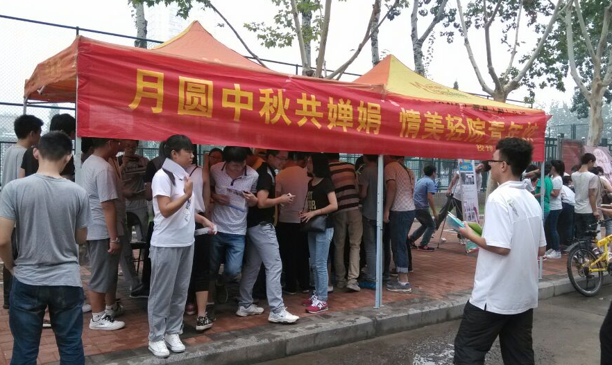 为了让新来到轻院大家庭的2014级同学尽快适应全新的大学生活,让正在军训而无法与家人共度节日的广大新生感受到轻院家的温馨,9月8日,由校团委主办,《轻院青年》编辑部承办的以“月圆中秋共婵娟情美轻院青春炫”为主题的中秋有奖知识竞猜活动在东风校区和科学校区校园主干道成功举办。