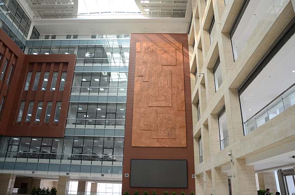 逸夫图书馆二层共享大厅陈列的第三件艺术作品是紫铜锻造的大型浮雕(高14米、长6.18米),作品名为《传承》,由我校艺术设计学院美术系雕塑专业教师创作。