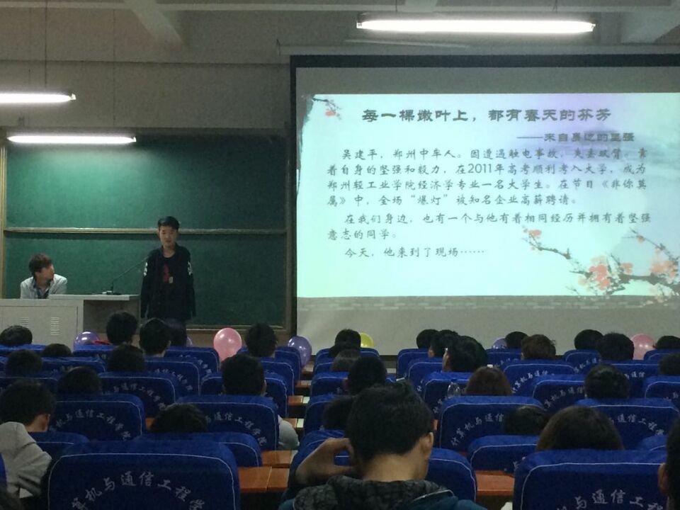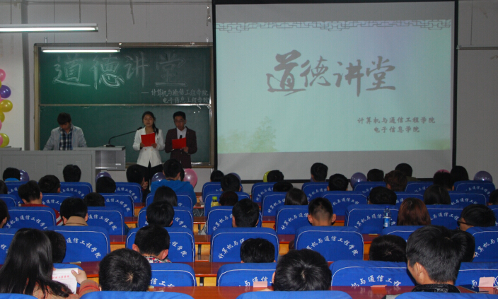 4月19日晚,我校在科学校区计算机楼217举行举办“道德讲堂”活动,本次活动以“走进‘道德讲堂’,传递正能量”为主题,吸引了科学校区近300名学生代表参加活动。此次活动由我校文明办主办,计算机与通信工程学院承办。