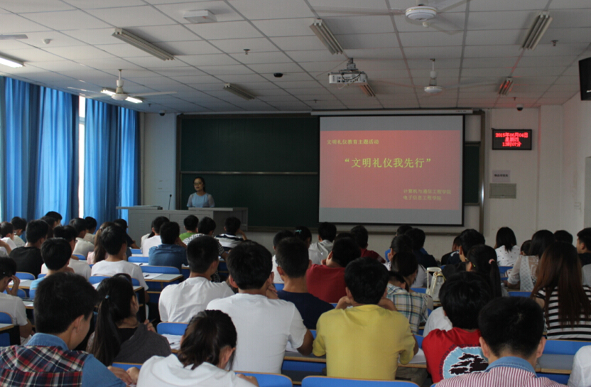 2015年6月4日,我校在二教楼802、804举办了“文明礼仪我先行”为主题的文明礼仪教育活动,此次活动由我校文明办主办,计算机与通信工程学院(电子信息工程学院)承办,学院共300余名学生干部、学生代表参加。