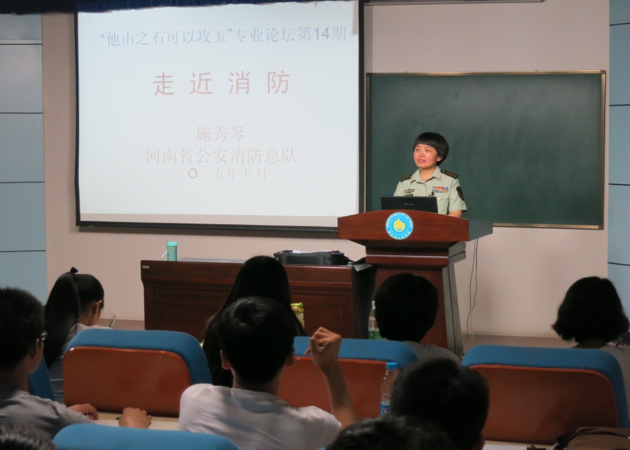 在第14期专业论坛中,河南省消防总队防火部施秀琴高工以“走进消防”为题,结合近几年发生的几起重大火灾案例,分别针对“正确认识火灾、全面认识专业消防队伍、正确了解建筑消防设施以及对未来消防行业发展的展望”等内容进行了介绍。通过施工的此次讲座,不仅提高了大家的消防意识,改变了大家的防火观念,还有助于大家掌握基本的火灾预防、报警、疏散以及逃生技能,增强了学生对消防专业知识的了解与掌握,激发了学生对本专业的学习兴趣。