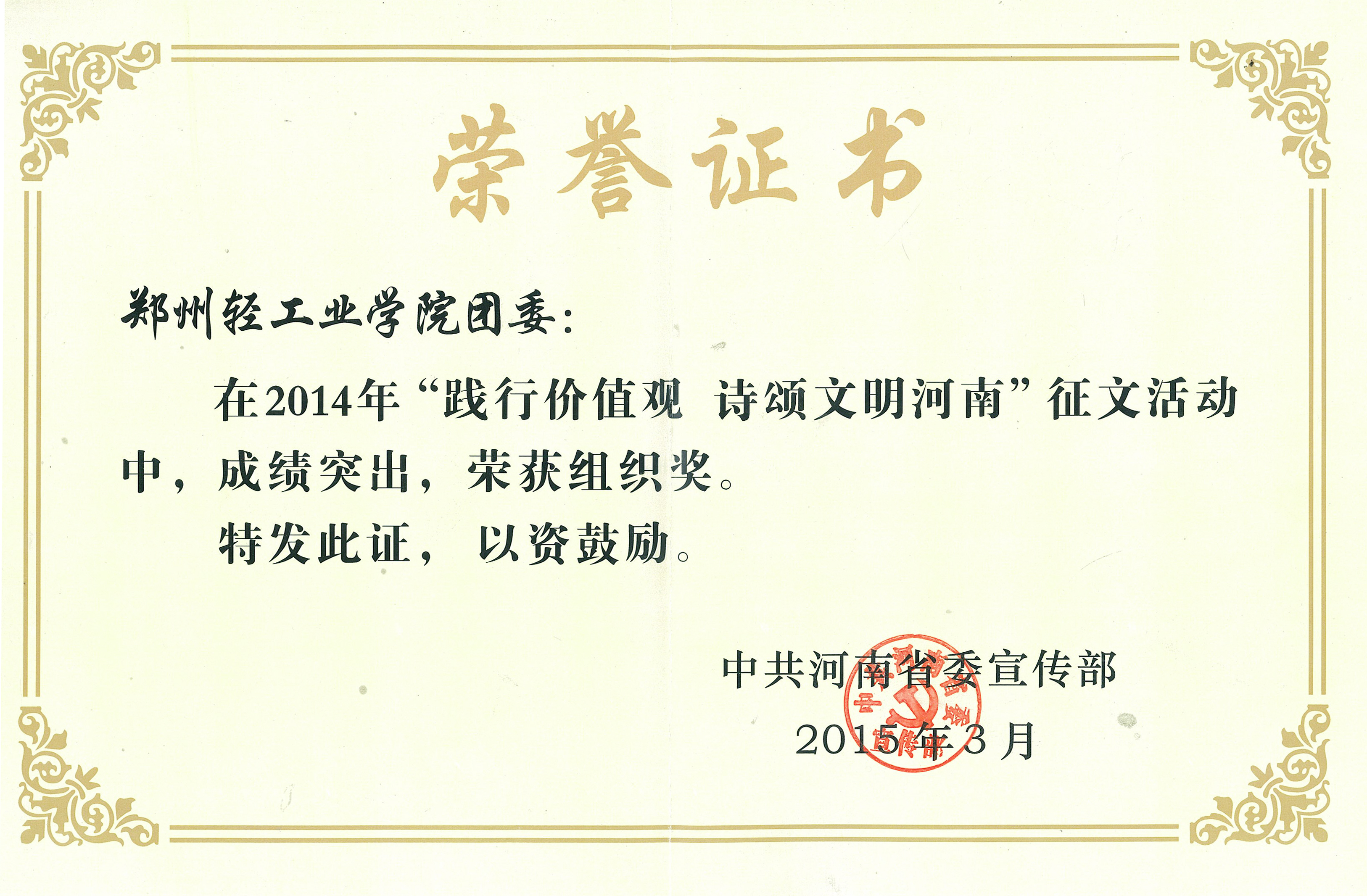 近日,我校团委在河南省委宣传部等六部门共同开展的“践行价值观、诗颂文明河南”征文活动中被评为优秀组织奖,全省共评出十名。