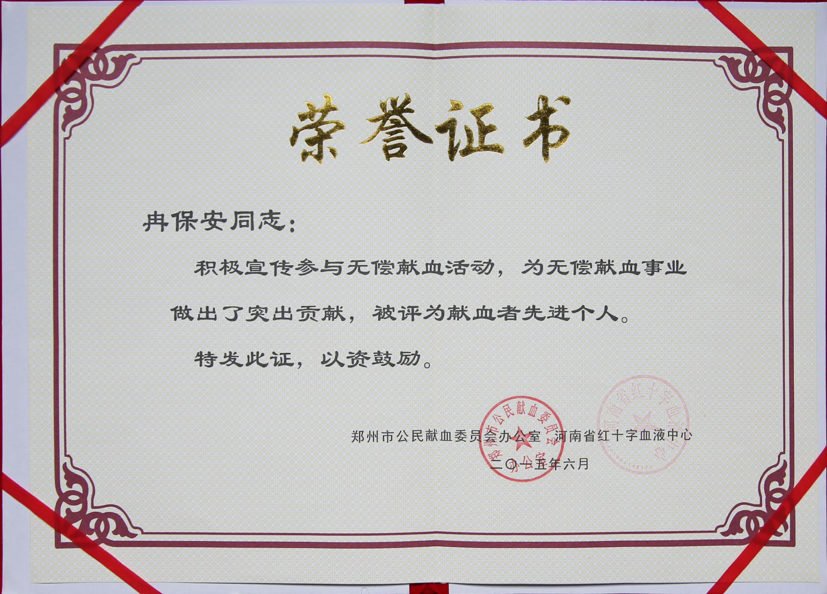 6月14日第12个“世界献血者日”到来之际由省红十字血液中心、映象网、郑州人民广播电台、省医学会输血分会组织的“感谢你挽救我的生命”表彰活动在省红十字血液中心举行。我校被命名为“固定无偿献血者团队”,后勤集团职工冉保安无偿献血满100次,被评为省“献血者先进个人”。