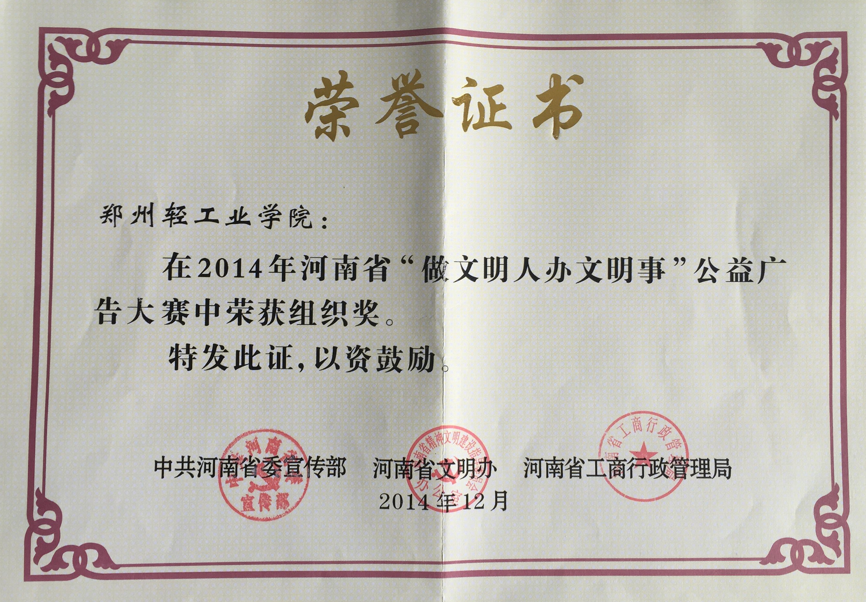 日前,省委宣传部、省文明办、省工商局联合下发文件,对2014年河南省“做文明人、办文明事”公益广告大赛中获奖的单位和个人进行表彰,我校获优秀组织奖,我校学生赵韩梅创作的作品获三等奖。