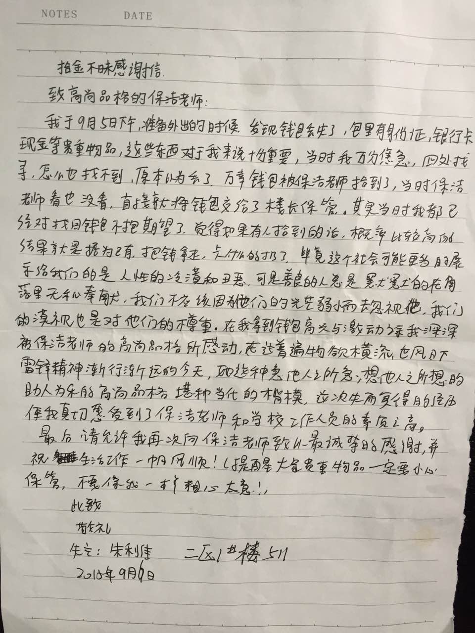 这个早上,和平时没什么不一样,而李雪华用她的无私与善良,温暖了一颗同学的心。我们相信,这位同学得到的不仅是丢失的钱包,更是对平凡岗位员工的尊敬、理解和对社会的信任感。环境育人、道德育人,后勤集团员工李雪华拾金不昧的高尚品质值得我们每一个人学习!
