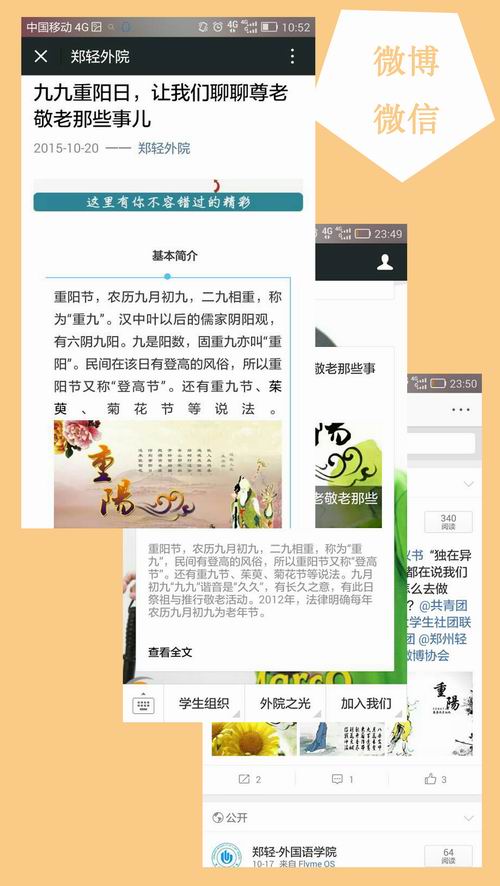 在庆祝活动中,学院学生组织还通过官方微博、微信等形式宣传、介绍传统节日,发出九九重阳,聊聊尊老敬老那些事的话题,引起广大学生热议。