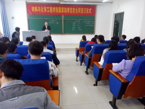 为了进一步做好2015年国家助学贷款工作,响应学校文明办开展诚信教育的号召,10月30日中午材料与化学工程学院在科学校区化工楼218教室召开2015年国家助学贷款诚信教育大会及合同签订仪式,党总支宋德涛副书记、负责学生助学贷款的郭老师和本学年的贷款学生参加了大会。