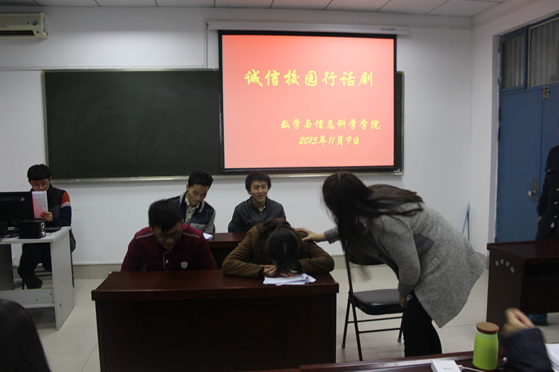 为响应校文明办号召,宣传国家资助政策及相关知识,培养广大学生的诚信观念,促进大学生健康成长。11月9日晚,数学与信息科学学院在东一楼216室举办了“诚信校园行”短剧大赛。