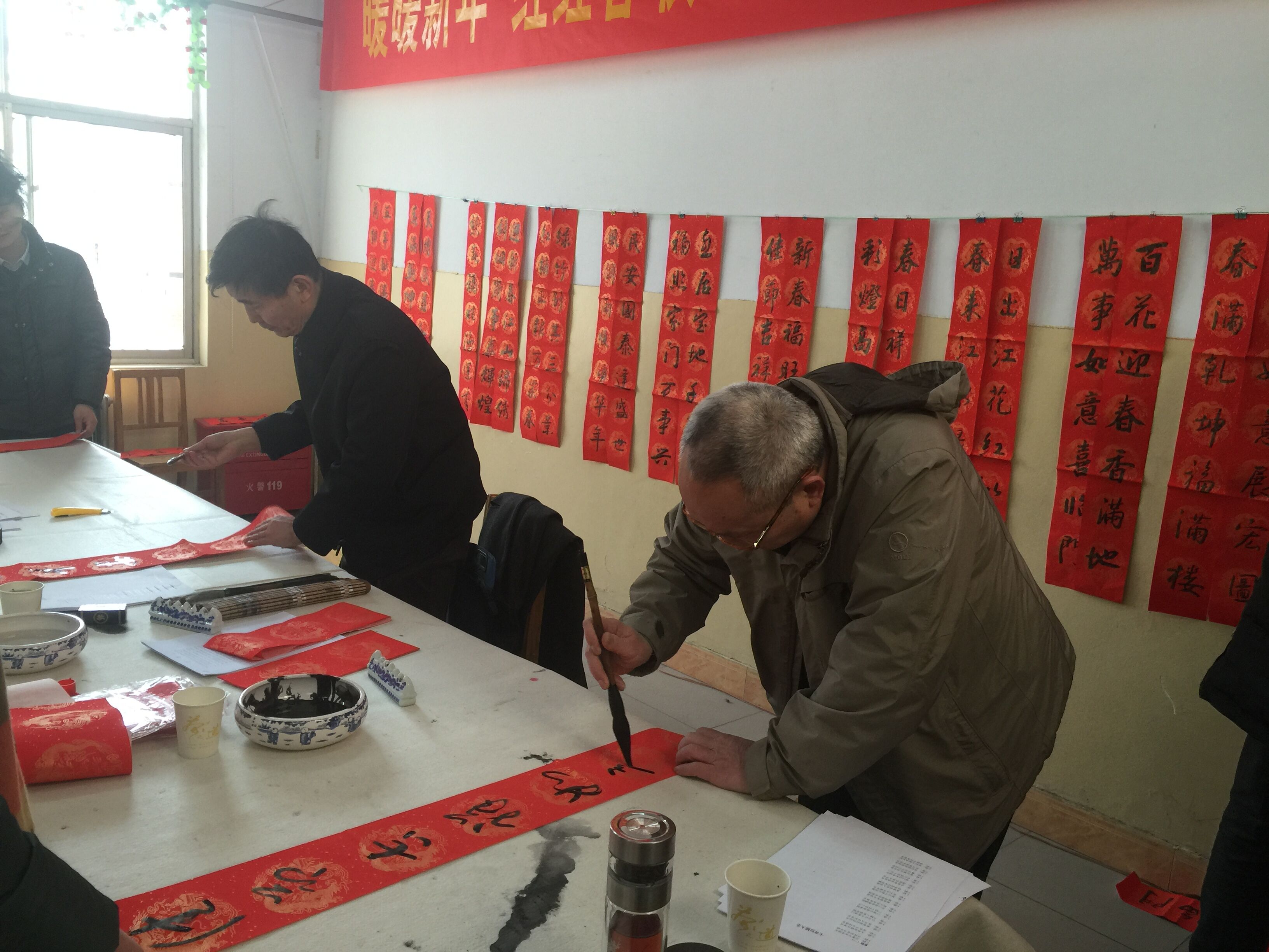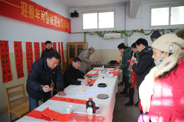 党委副书记窦效民及我校其他书法爱好者来到活动现场,泼墨挥毫,笔走龙蛇,行、隶、草等多种书体各显神韵,一幅幅散发清新墨香的美好祝福跃然纸上。春联既有挥别羊年、喜迎猴年辞旧迎新的美好愿景,也有歌颂党恩、宏图大展的励志高歌。前来领取春联的老师们尤其是离退休老同志更是络绎不绝、欢喜不已,很多作品墨迹未干已被领走,一幅幅吉祥喜庆、墨宝飘香的春联被老师们捧在手里,有的忙着晾晒墨迹,有的细细品读,一张张笑脸伴随笔墨飞扬……整个活动场地处处洋溢着浓浓的欢乐、祥和的气氛,浓浓的年味儿“扑面而来”。